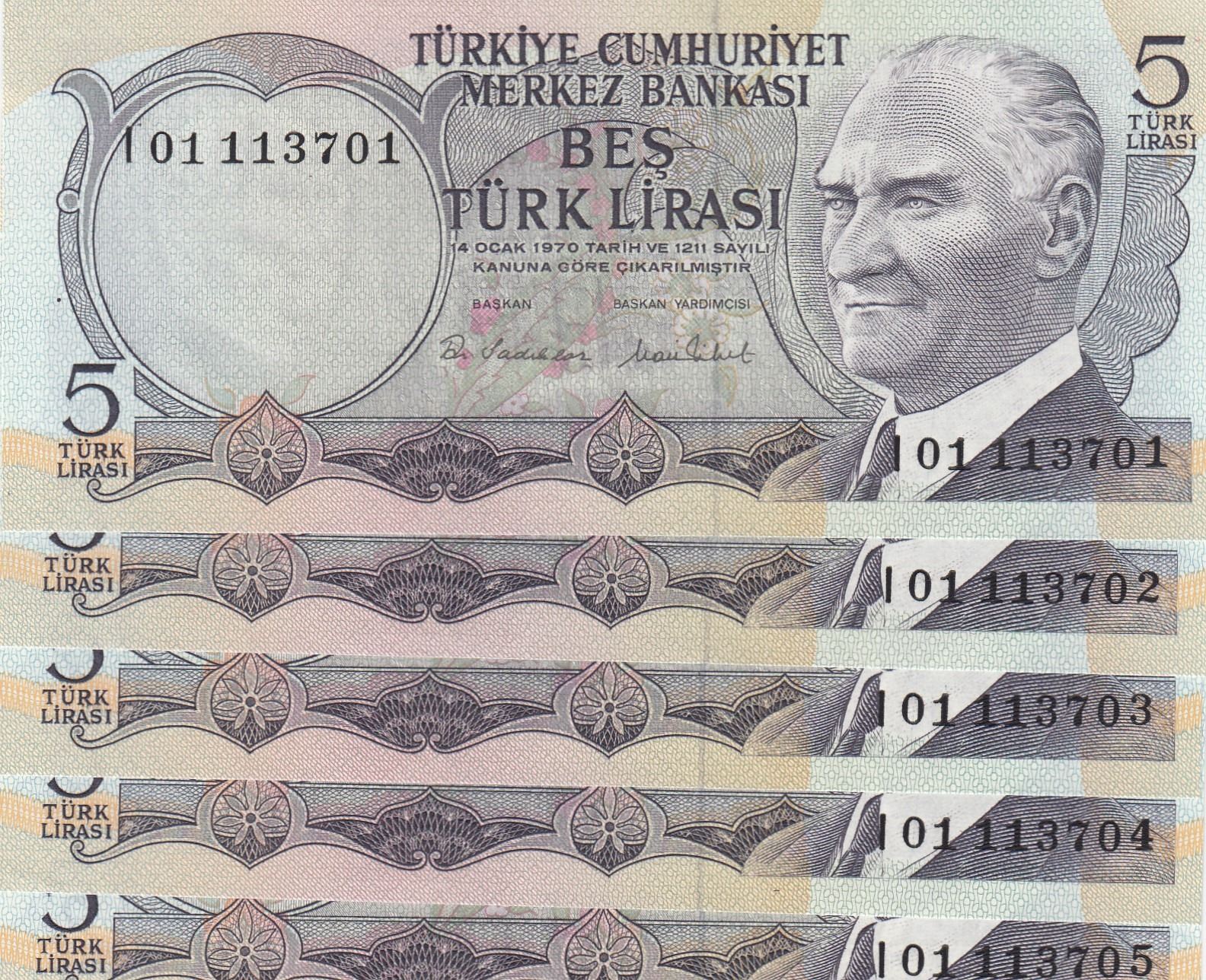 Turkey, 5 Lira, 1976, UNC, 6/2. Emission, p185, "I01", (Total 5 banknotes)br/Atatürk portrait, serial numbers: I01 113701-05