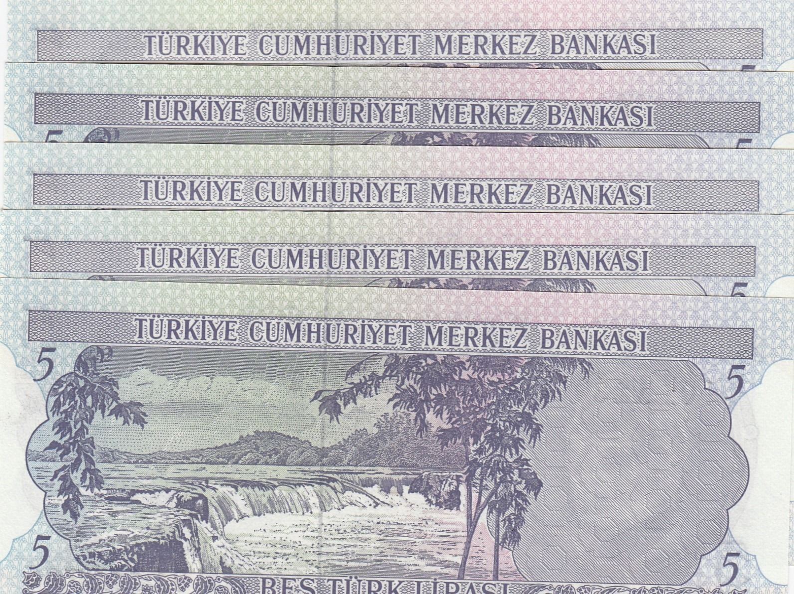 Turkey, 5 Lira, 1976, UNC, 6/2. Emission, p185, "I01", (Total 5 banknotes)br/Atatürk portrait, seria