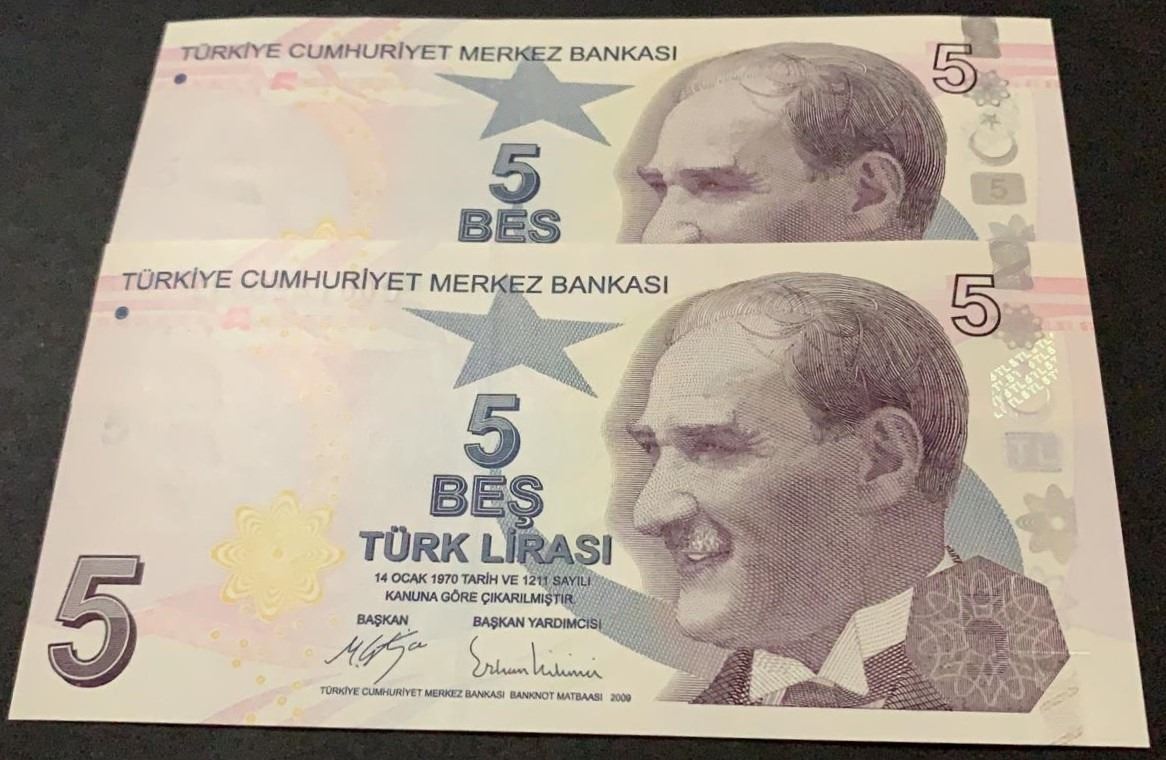 Turkey, 5 Lira, 2017, UNC, 9/3. Emission, p222c, "C001" first prefix and nice numbers, (Total 2 bank