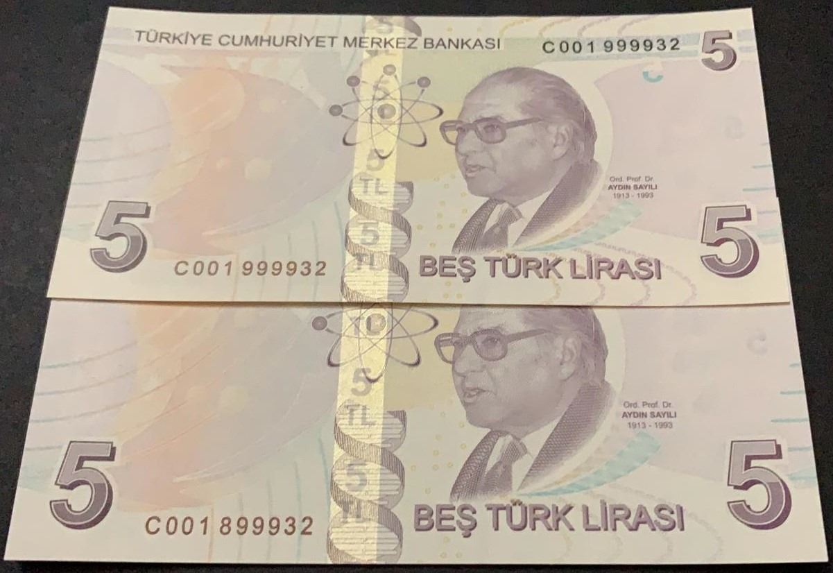 Turkey, 5 Lira, 2017, UNC, 9/3. Emission, p222c, "C001" first prefix and nice numbers, (Total 2 banknotes)br/serial numbers: C001 899932 and C001 999932