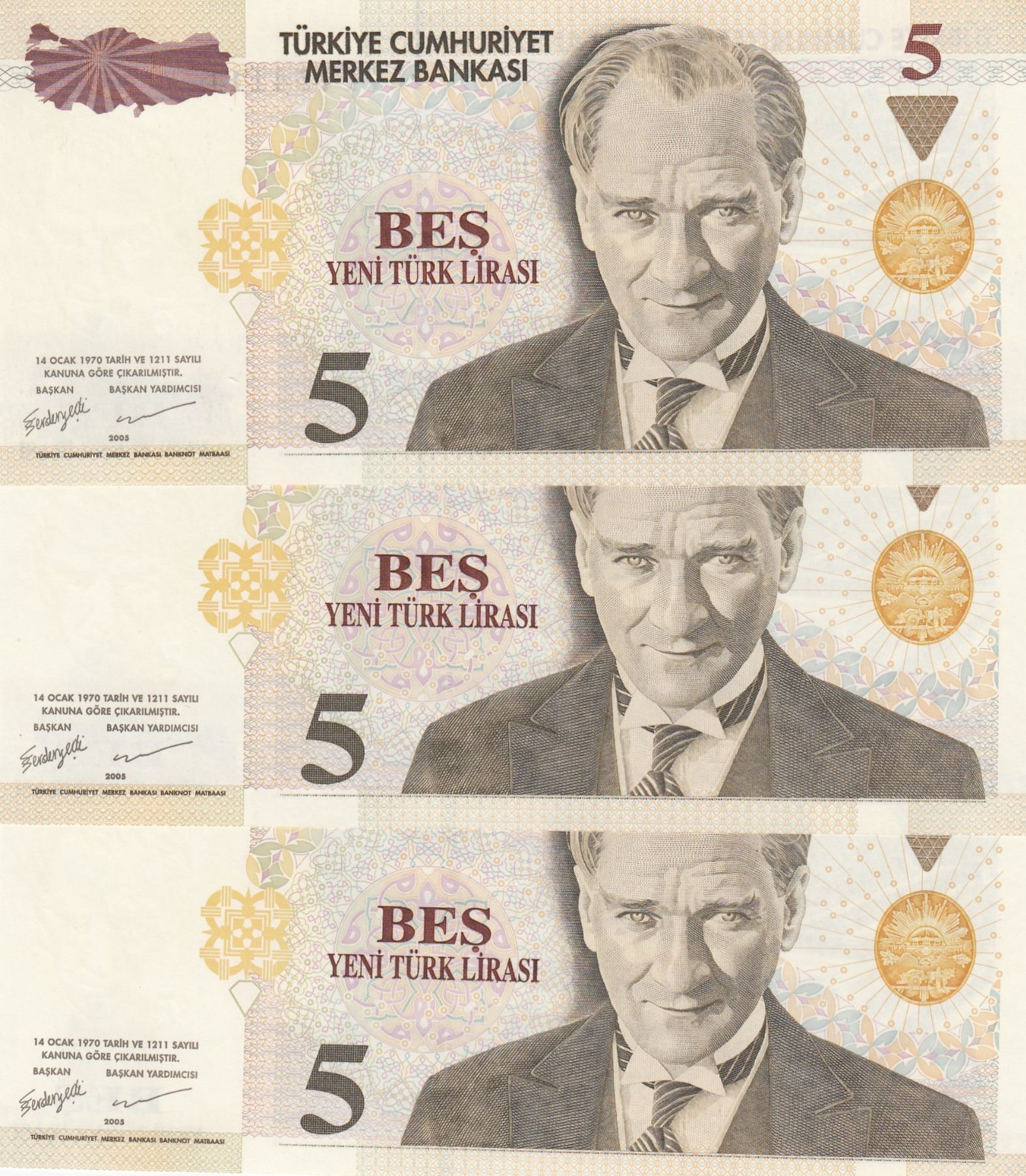 Turkey, 5 New Turkish Lira, 2005, UNC, 8/1. Emission, p217, (Total 3 banknotes)br/all banknotes end
