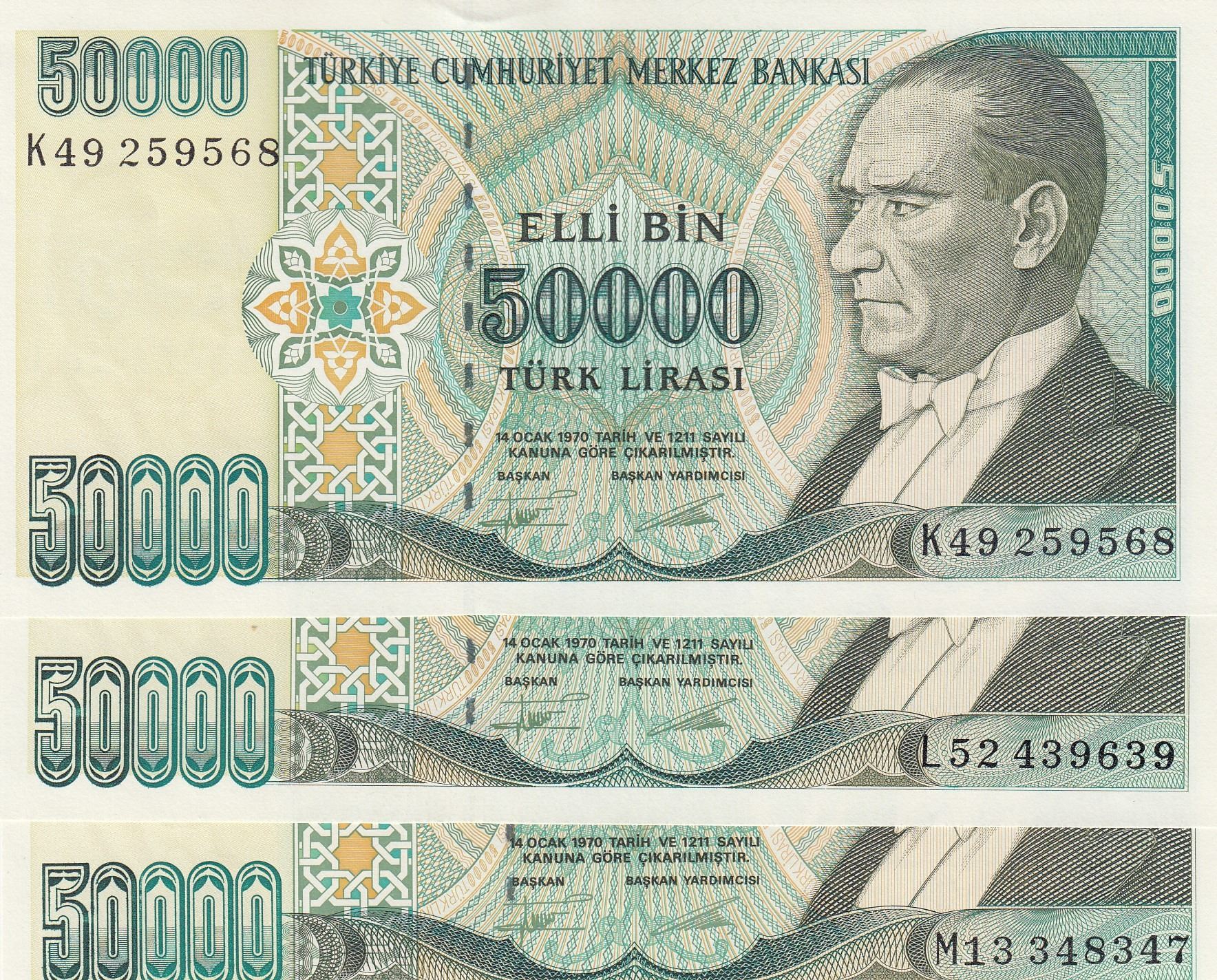 Turkey, 50.000 Lira, 1995, UNC, 7/2. Emission, p204, (Total 3 banknotes)br/serial numbers: K49 2595