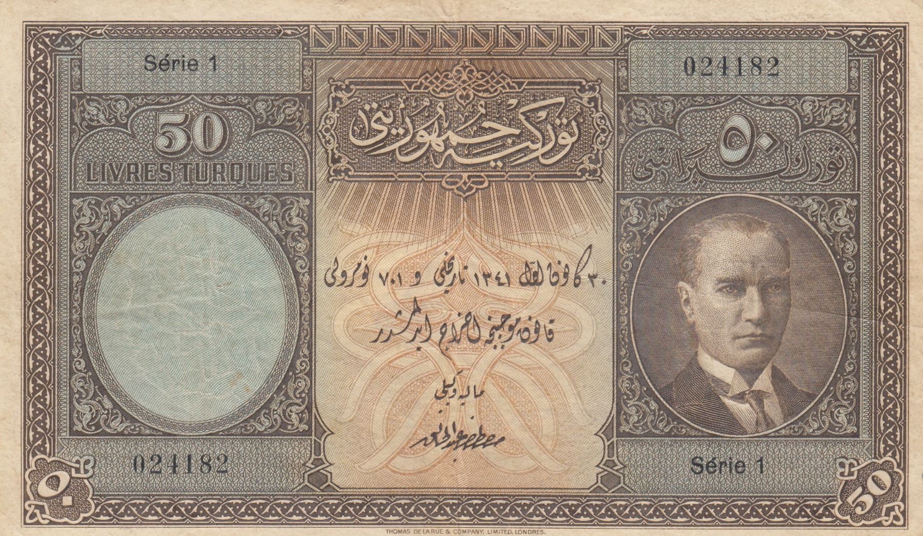 Turkey, 50 Lira, 1927, XF (-), 1/1. Tertip, p122br/Atatürk portrait, serial number: 1 024182, natura