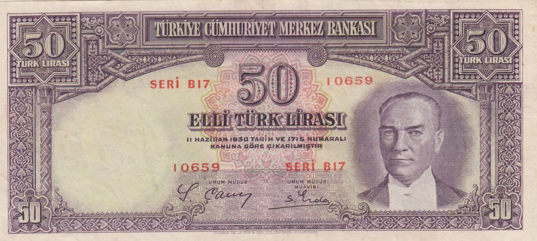 Turkey, 50 Lira, 1938, VF (+), 5/1. Emission, p129br/Atatürk portrait, serial number: B17 10659, nat
