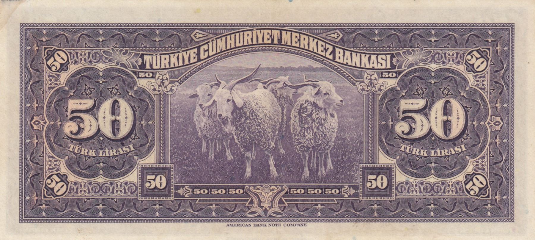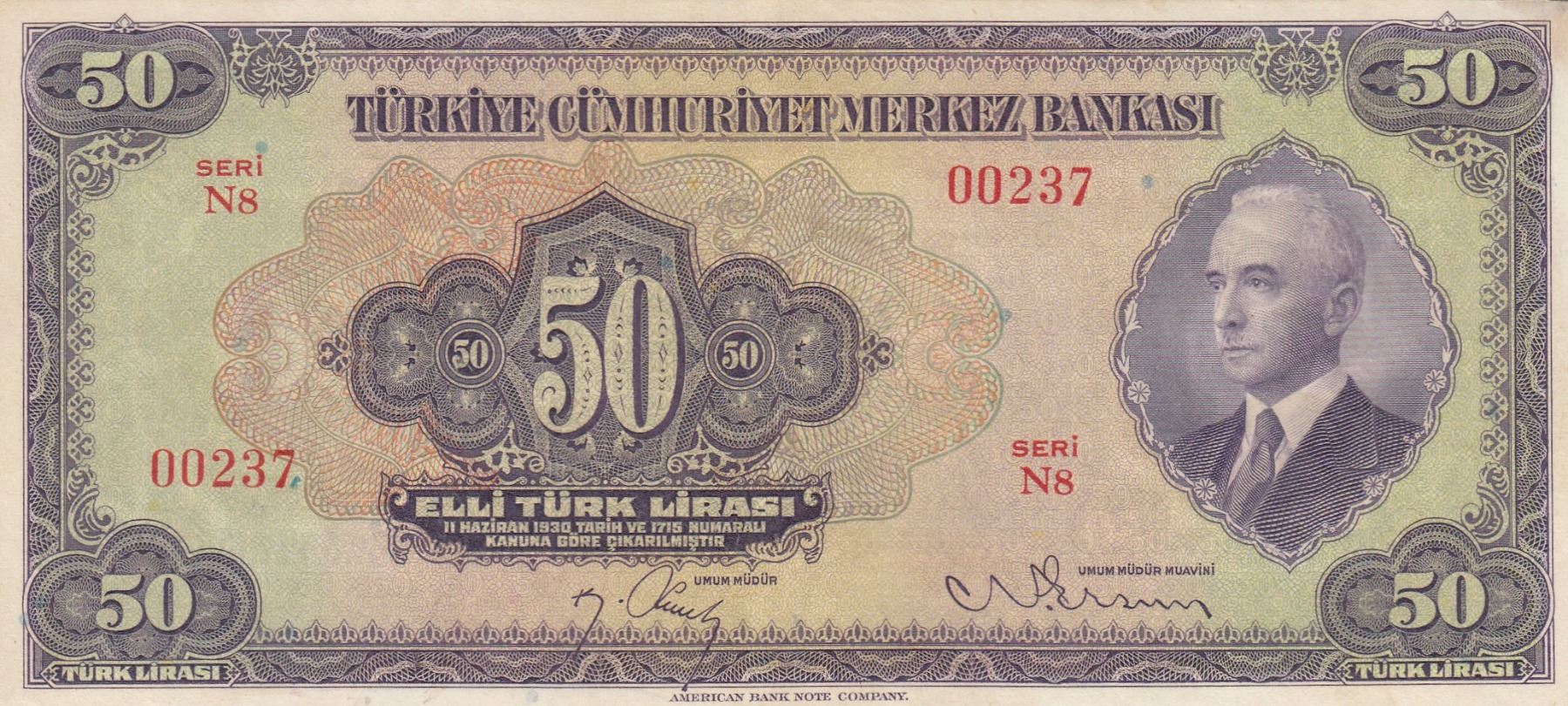 Turkey, 50 Lira, 1942, AUNC, 3/1. Emission, p142br/Inönü portrait, serial number: N8 00237