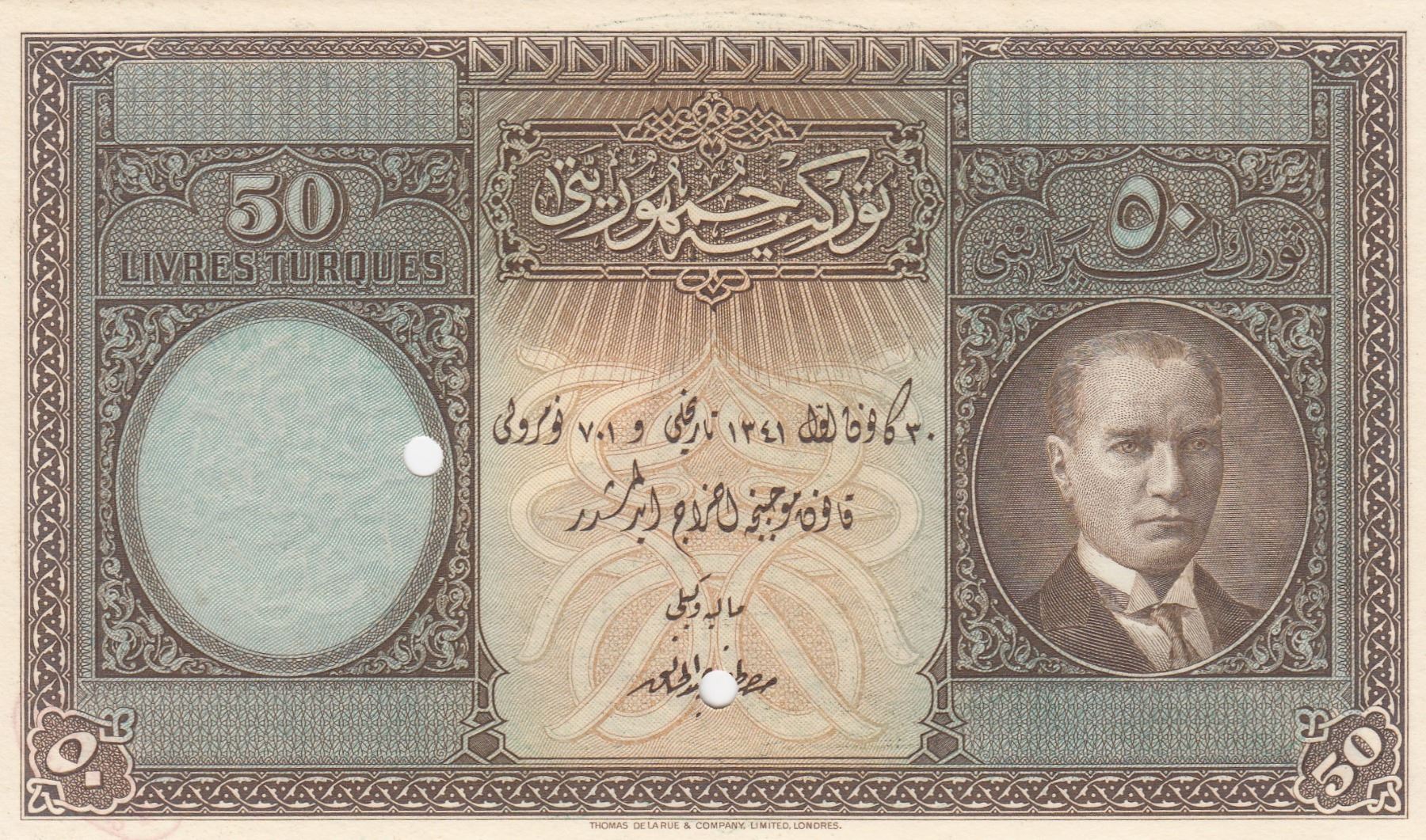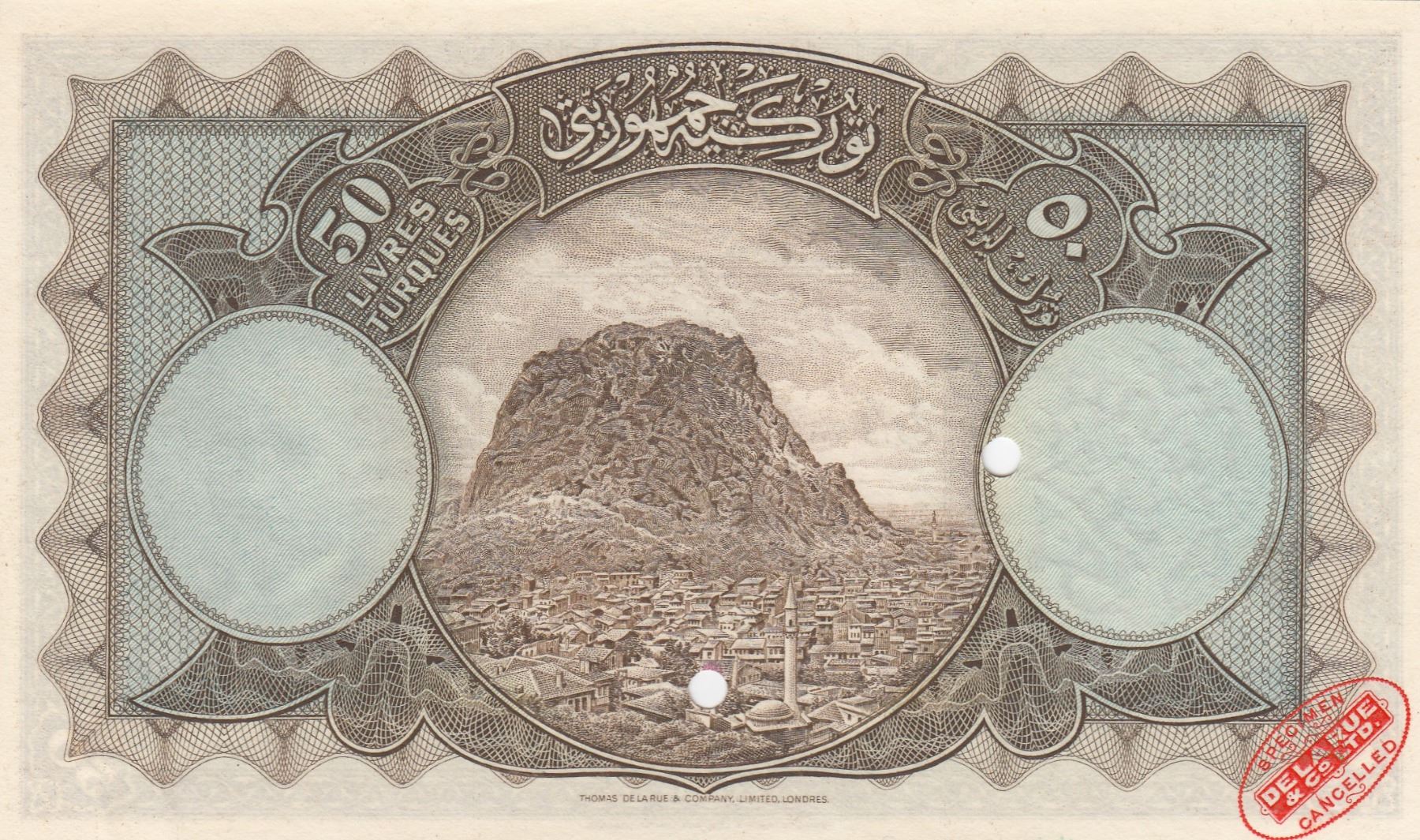 Turkey, 50 Livre, 1927, UNC, 1/1. Emission, p122, SPECIMENbr/no serial number. It is a rare example because of the Arabic text on it compared to many other specimens.