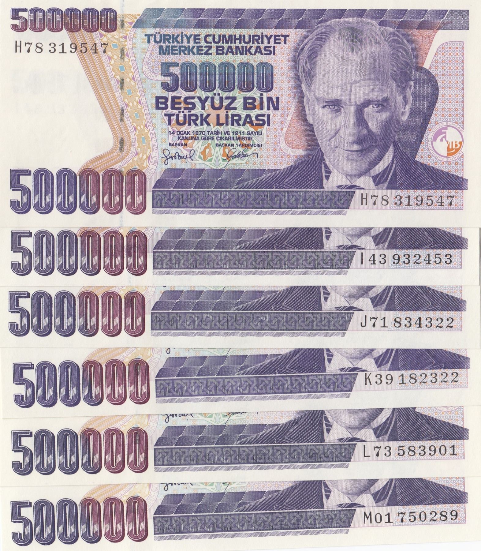 Turkey, 500.000 Lira, 1997, UNC, 7/4. Emission, p212, (Total 6 banknotes)br/prefiks numbers: H78, I43, J71, K39, L73, M01; Set of all letters of the 1997 edition