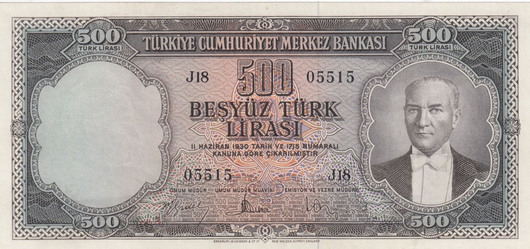 Turkey, 500 Lira, 1959, UNC, 5/2. Emission, p171br/serial number: J18 05515,