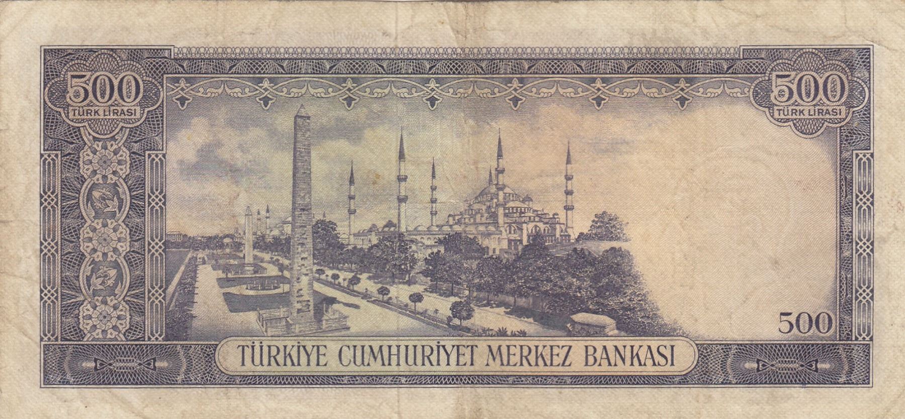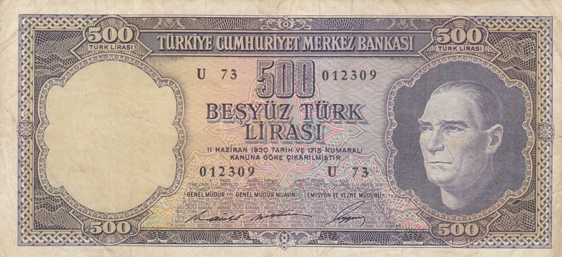 Turkey, 500 Lira, 1968, FINE, 5/4. Emission, p183br/Atatürk portrait, serial number: U73 012309