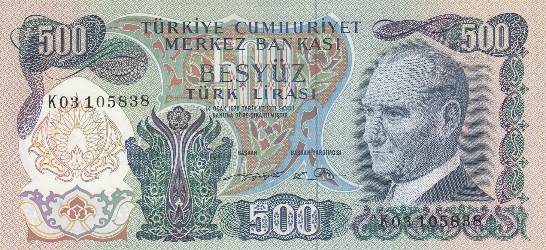 Turkey, 500 Lira, 1974, UNC, 6/2. Emission, p190b, "K03"br/Atatürk portrait, serial number: K03 105838