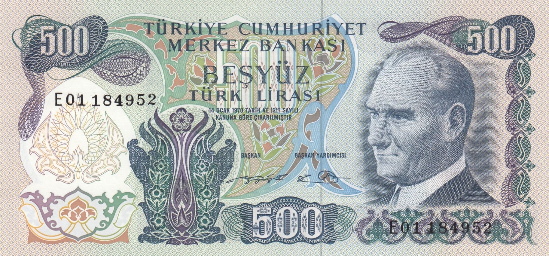 Turkey, 500 Lira, 1974, UNC, 6/2. Emission, p190c, "E01"br/Atatürk portrait, serial number: E01 184952