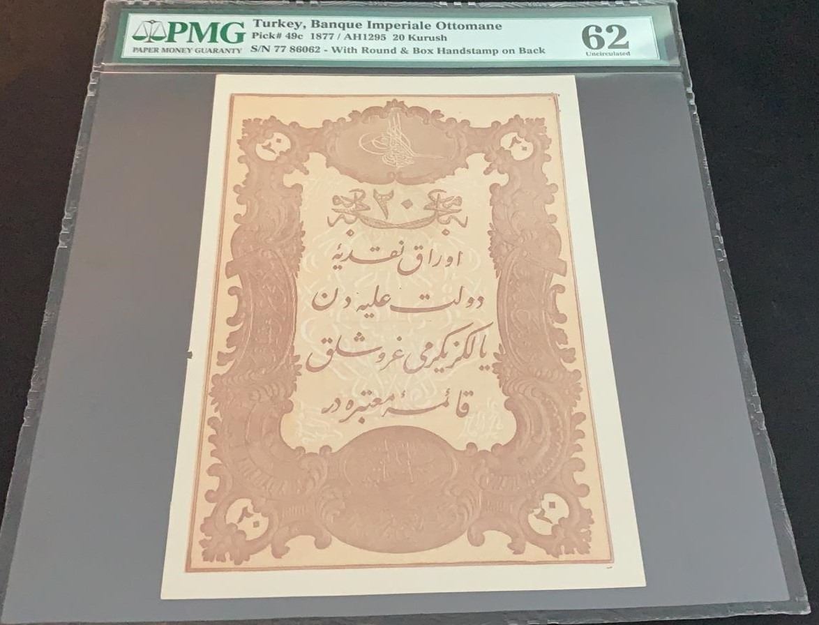 Turkey, Ottoman Empire, 20 Kurush, 1877, UNC, p49dbr/PMG 62, serial number: 77-86062, II. Abdülhami