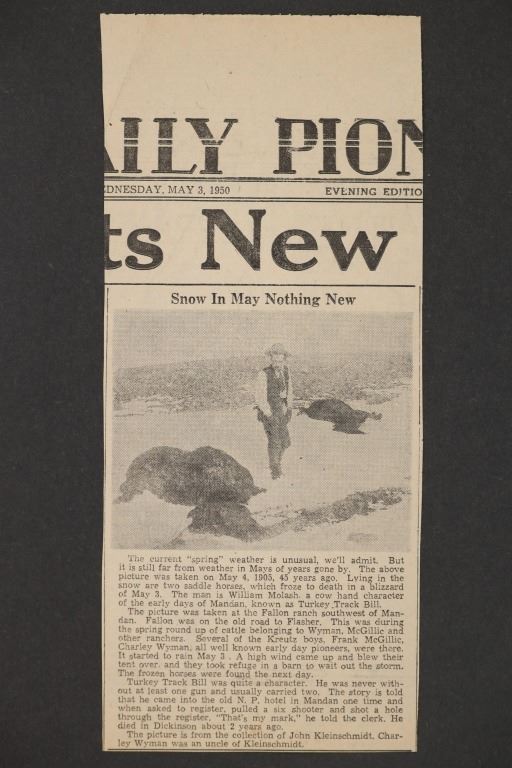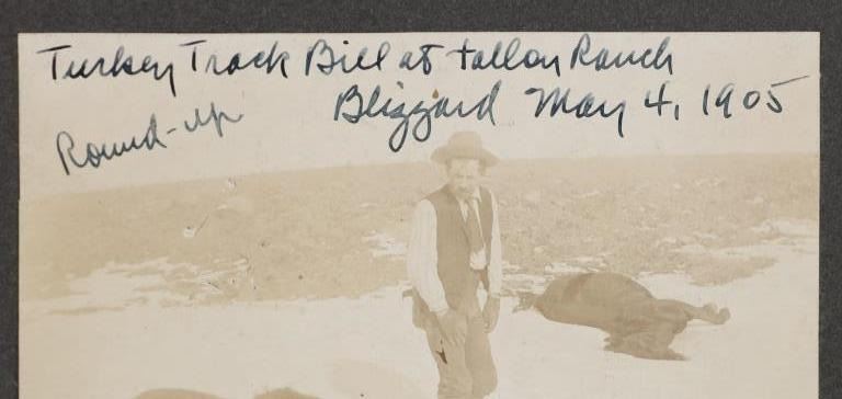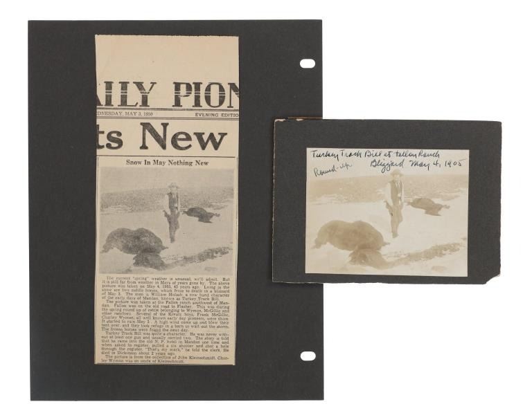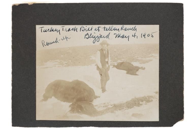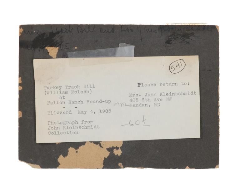 For your consideration is an Original Turkey Track Bill Photograph, 1905, attributed to renown photographer Frank Fiske. Provenance: From the John Kleinschmidt collection which was on loan to the C.M. Russell Museum from 1987 to 1993 and included in the "The Cowboy West: 100 Years of Photography 1992-1993 exhibit. In the annals of western North Dakota history there is one character that most typified the cowboy image, William Molash, better known as Turkey Track Bill. The photograph was taken after the Blizzard of May 1905. Fiske, primarily active among the Lakota Sioux on Standing Rock Indian Reservation in North and South Dakota, was a friend of the legend and most likely was the photographer. Of Turkey Track Fiske once said, "...there never was a more picturesque cowboy than this same Turkey Track..." The photograph shows Turkey Track standing on a snow covered field between two horses that are lying on the ground. While moving cattle during a spring round up at the Fallon Ranch south of Bismarck North Dakota, he and the crew sought dry shelter in a barn when strong winds accompanied a heavy rain storm. The men left their horses outside unaware of the impending disaster. The temperatures plummeted and the rainstorm became a blizzard, dropping between 4 inches and 4 feet of snow. The next day, the horses were found to have frozen to death. In an era without the warnings of modern weather forecasting, the storm caught western North Dakota by surprise. This photograph captures a legend of the American Wild West Frontier dealing with the stark realities of living in that same Wild West Frontier. The photograph is amazingly well preserved condition for its age, image is clear and slightly faded, age tanning. Backing mount board has information written on and attached on reverse identifying photograph and Kleinschmidt collection information. Photograph is labeled in ink, "Turkey Track Bill at Fallon Ranch Round-up Blizzard May 4, 1905". Bottom right corner of board is chipped. Photograph measures 3.625"W x 4.625"L, board measures 4.75"W x 6.625"L.