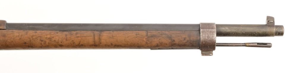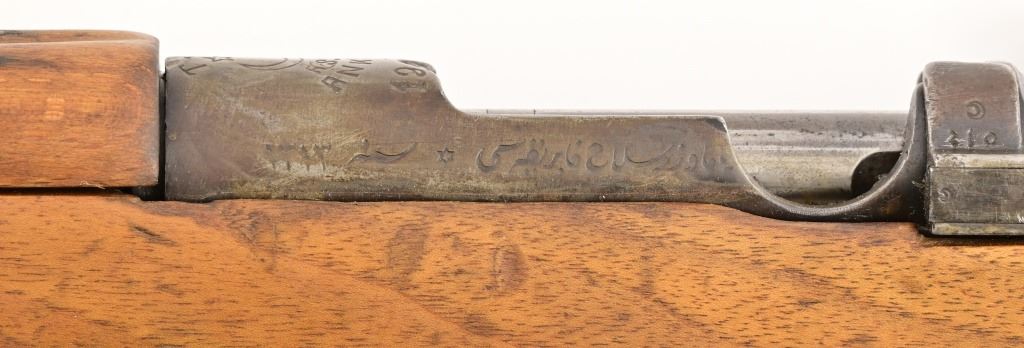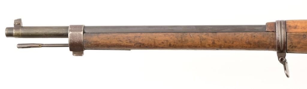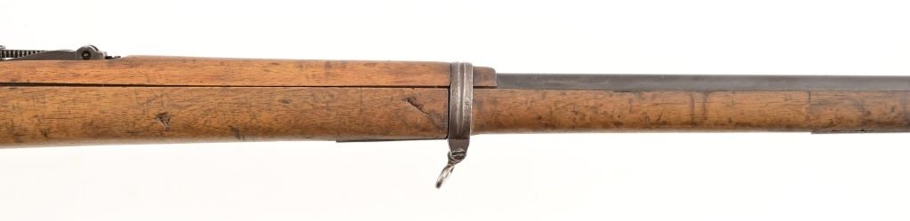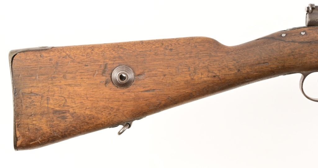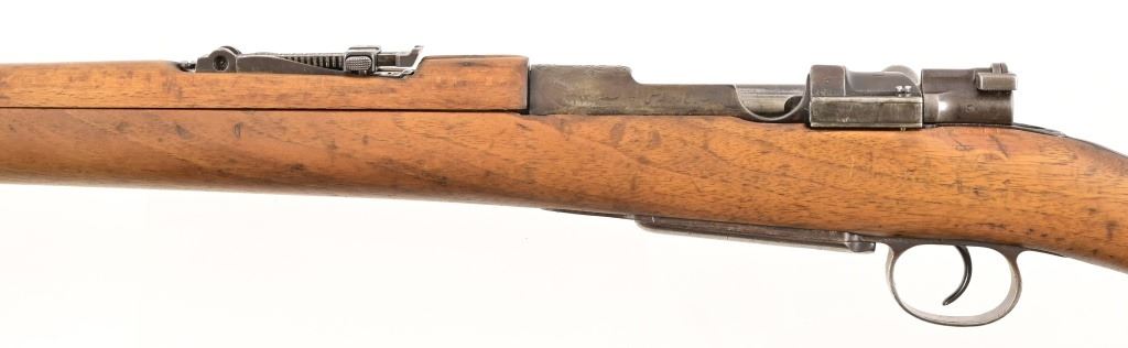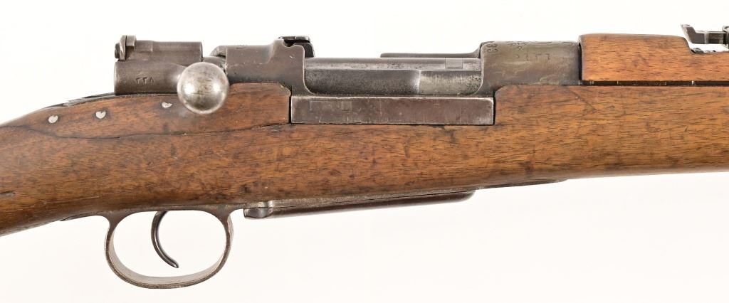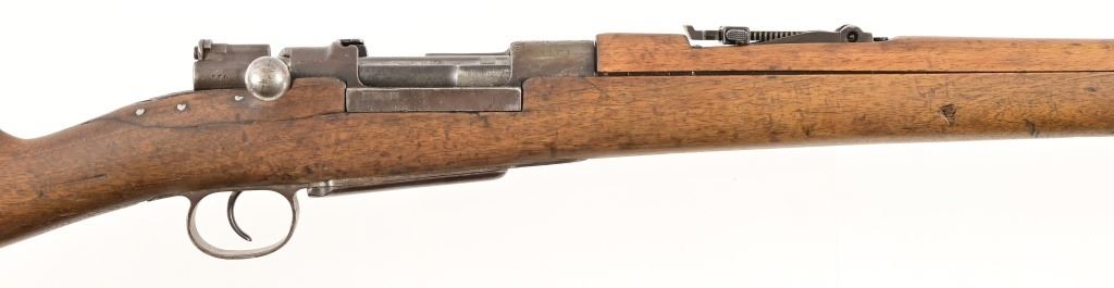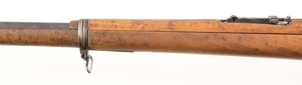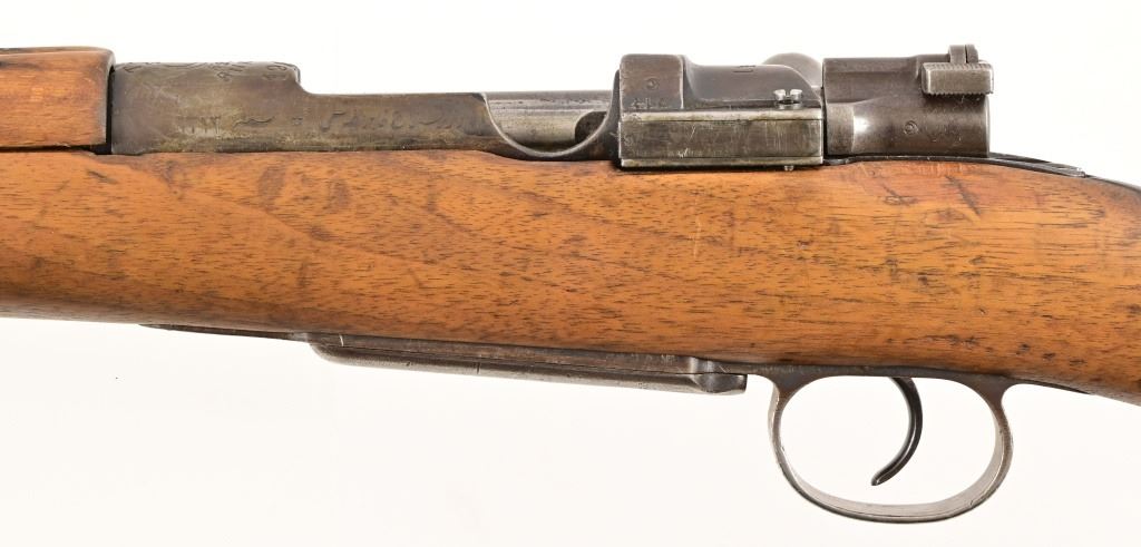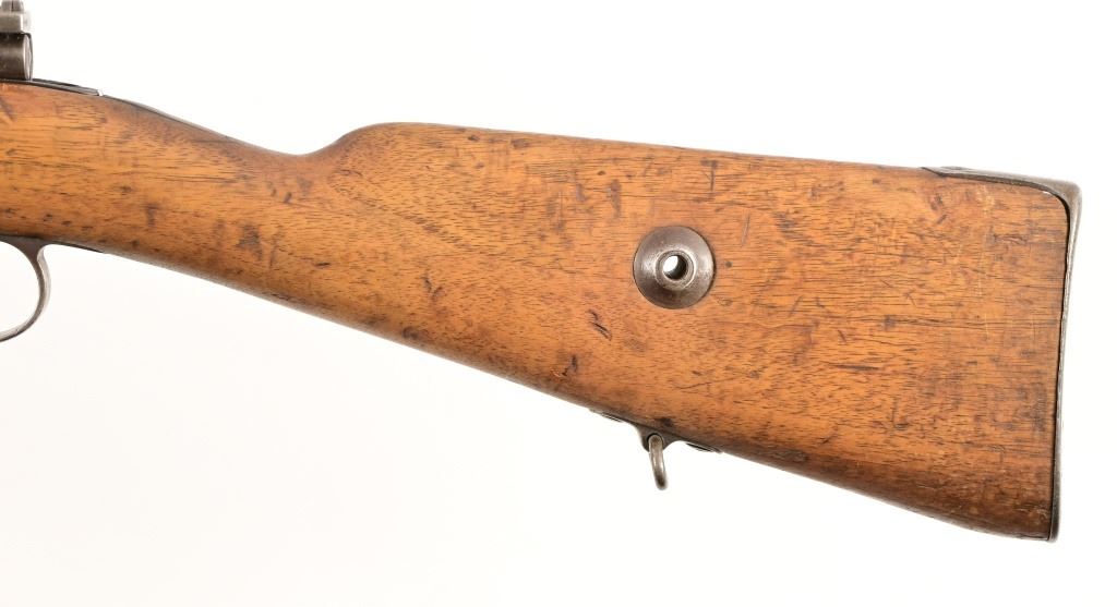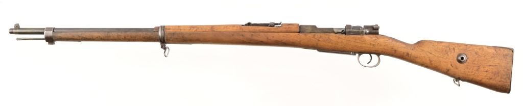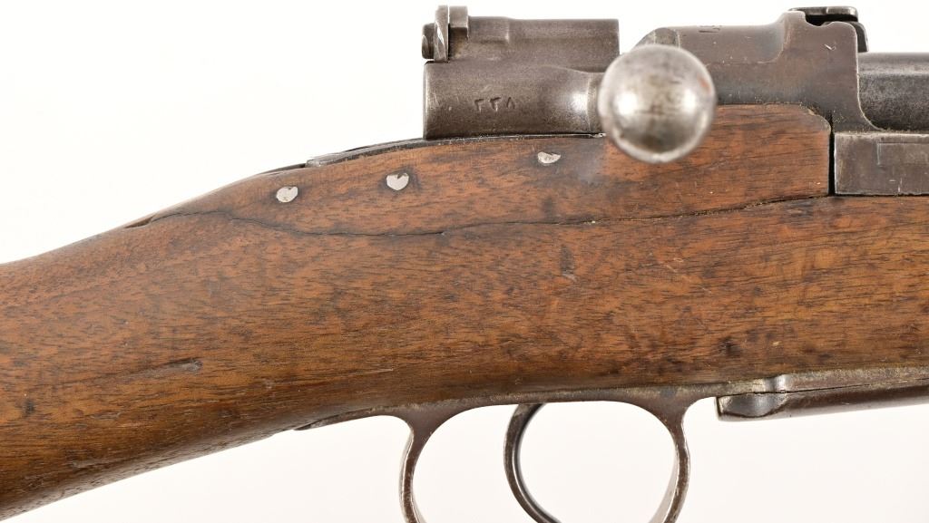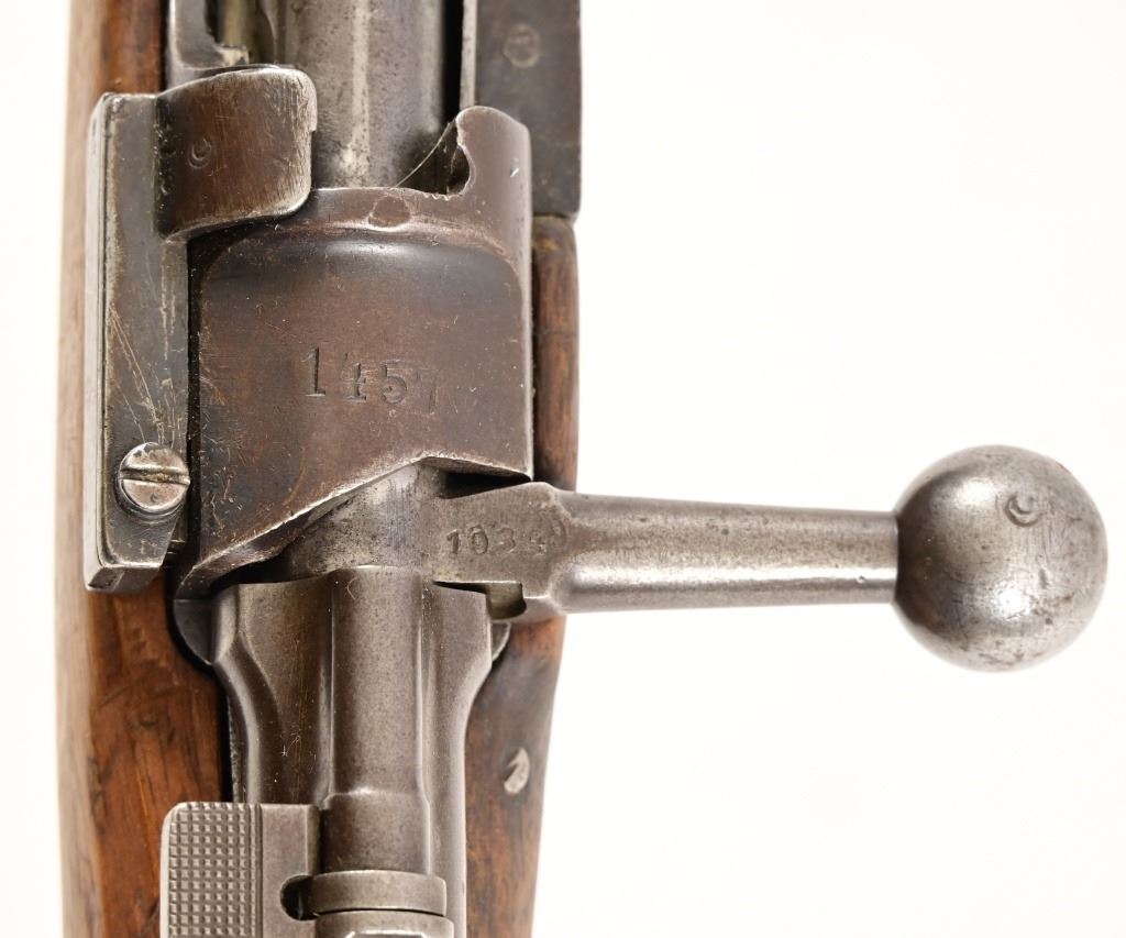 Serial 1457. Mouser action rifle, caliber unknown. 30" barrel, bore is dark but with rifling. Stock has interesting repair near bolt. Modern.