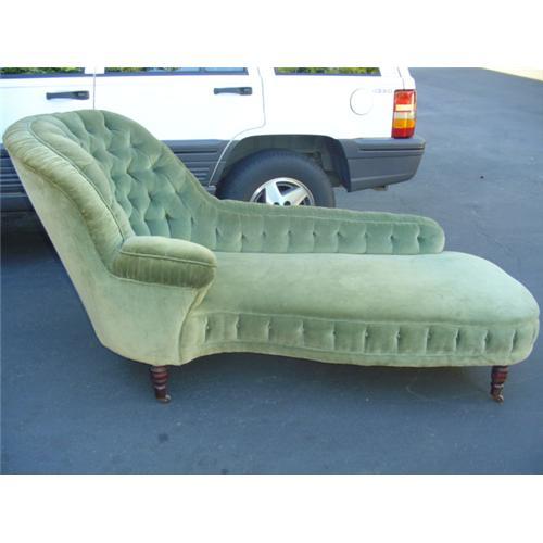 Victorian Furniture. Unusual hard to find piece of Americana. This "Turkish" style Chaise Lounge is American and dates circa 1890. What is interesting about this Chaise is the frame. The only wood on the chaise is the legs and base. The arms, seat, and back of the chair are constructed of wire and springs (making the Chaise slightly flexible). This, along with the horsehair stuffing, makes this Chaise Lounge very comfortable. Beautifully hand tied and tufted this Chaise would work well in a library, bedroom or parlor. I believe this chaise lounge have been reupholstered about 40 years ago with soft green velvet and its original horsehair stuffing. This is a very comfortable Chaise Lounge. The frame is in excellent condition.