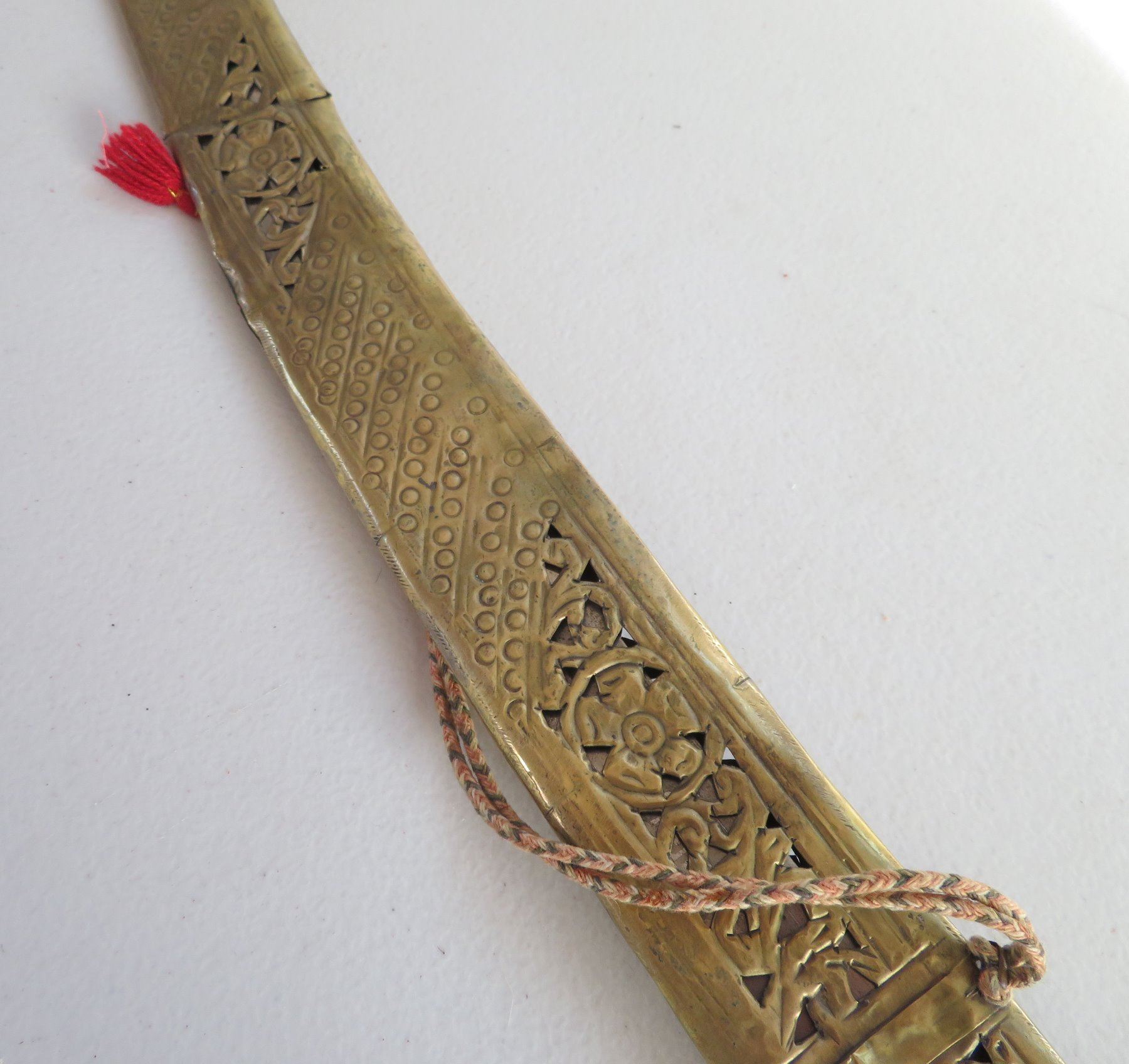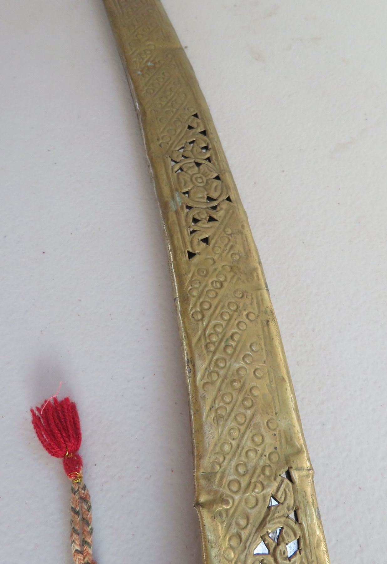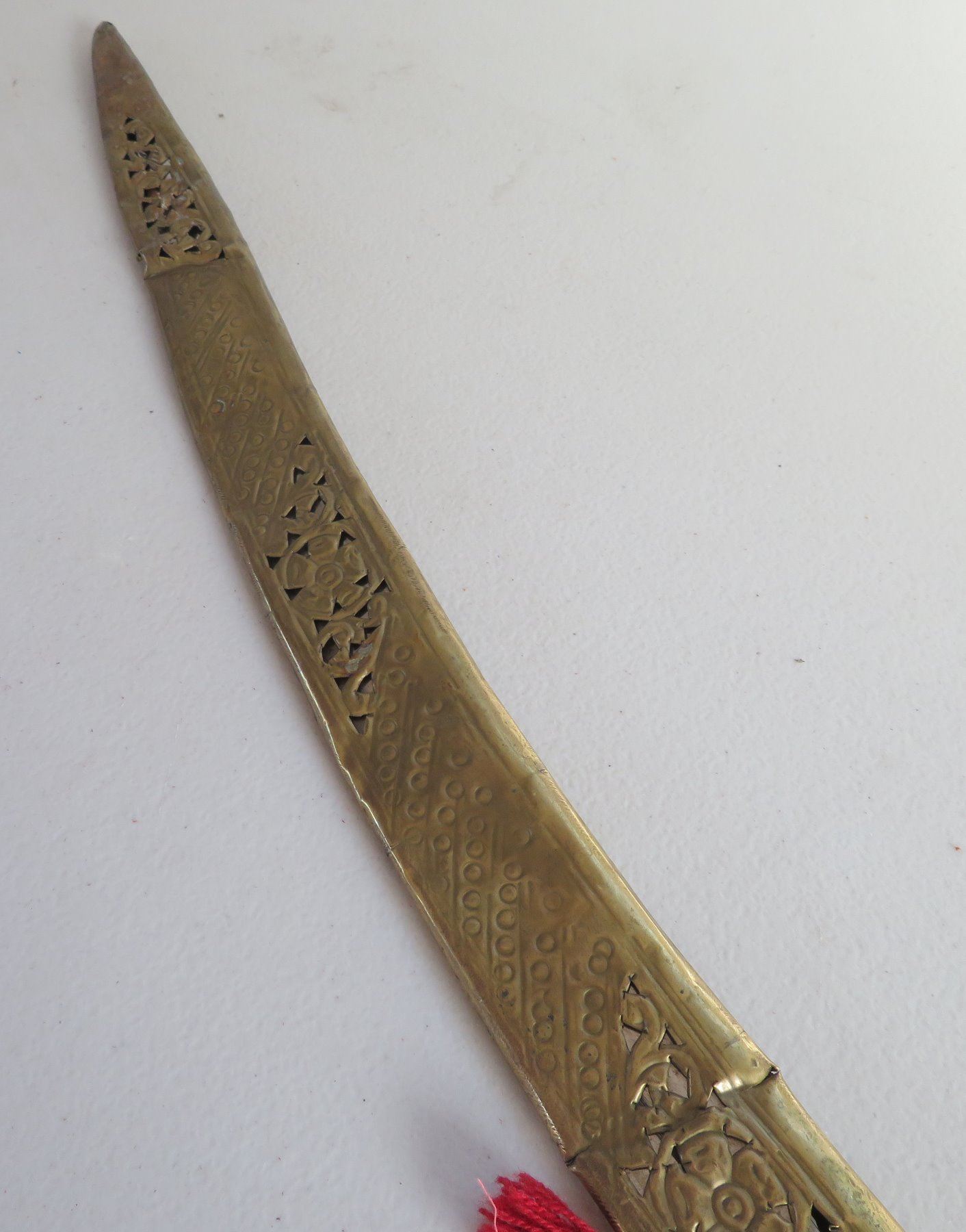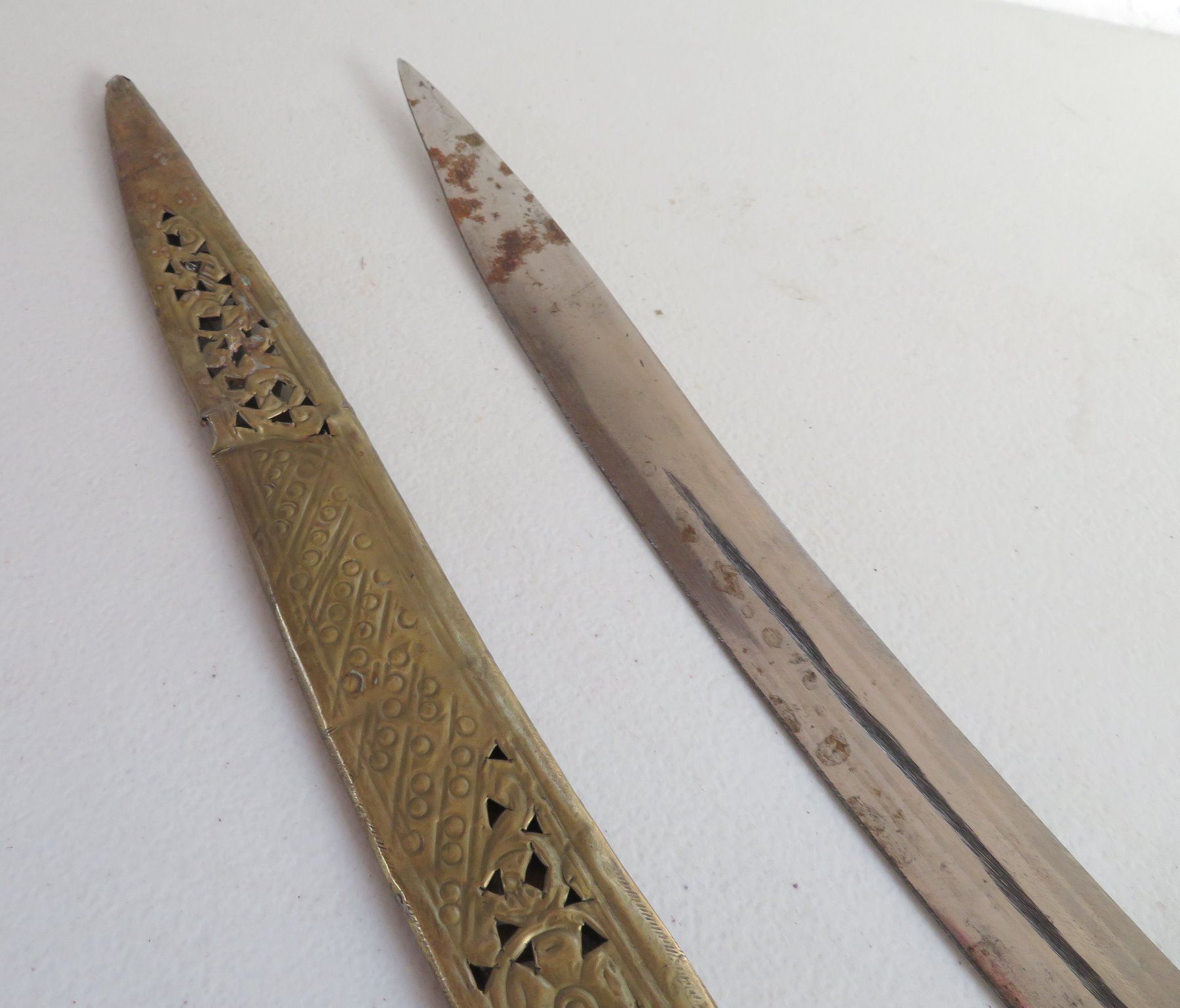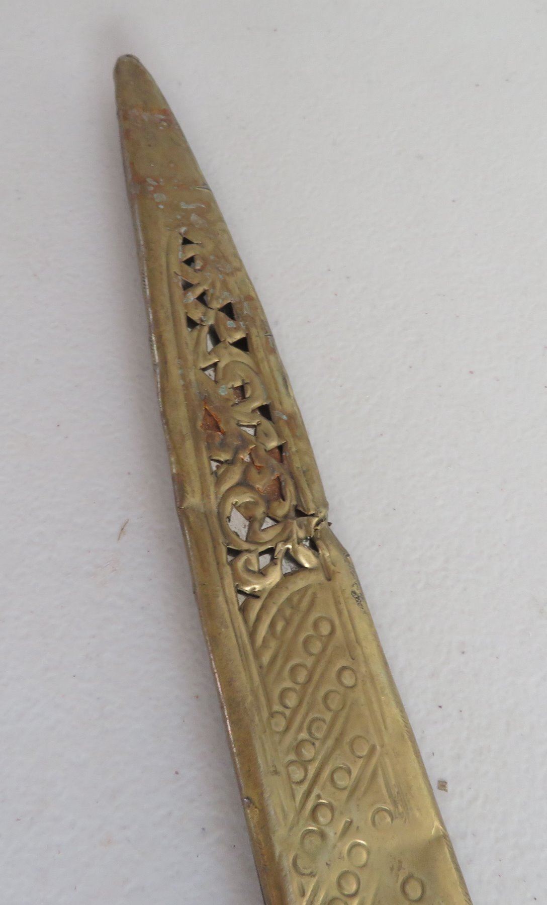 Turkish Dress Sword, c. 1900. Made of brass scabbard and steel blade, the item measures 34" x 3". Writing on blade. Southern Turkey. Condition: Scabbard damaged, bends nicks and wear, see images. Shipping: $55.00 USA estimate only, due to length and weight.
