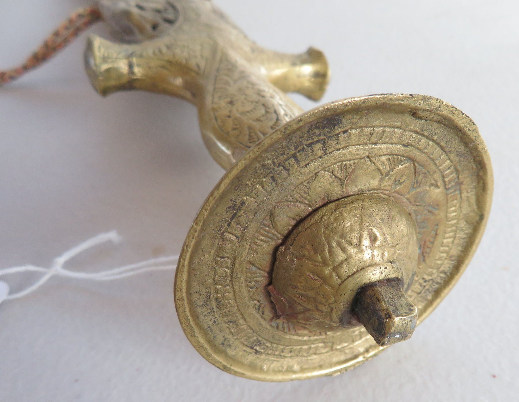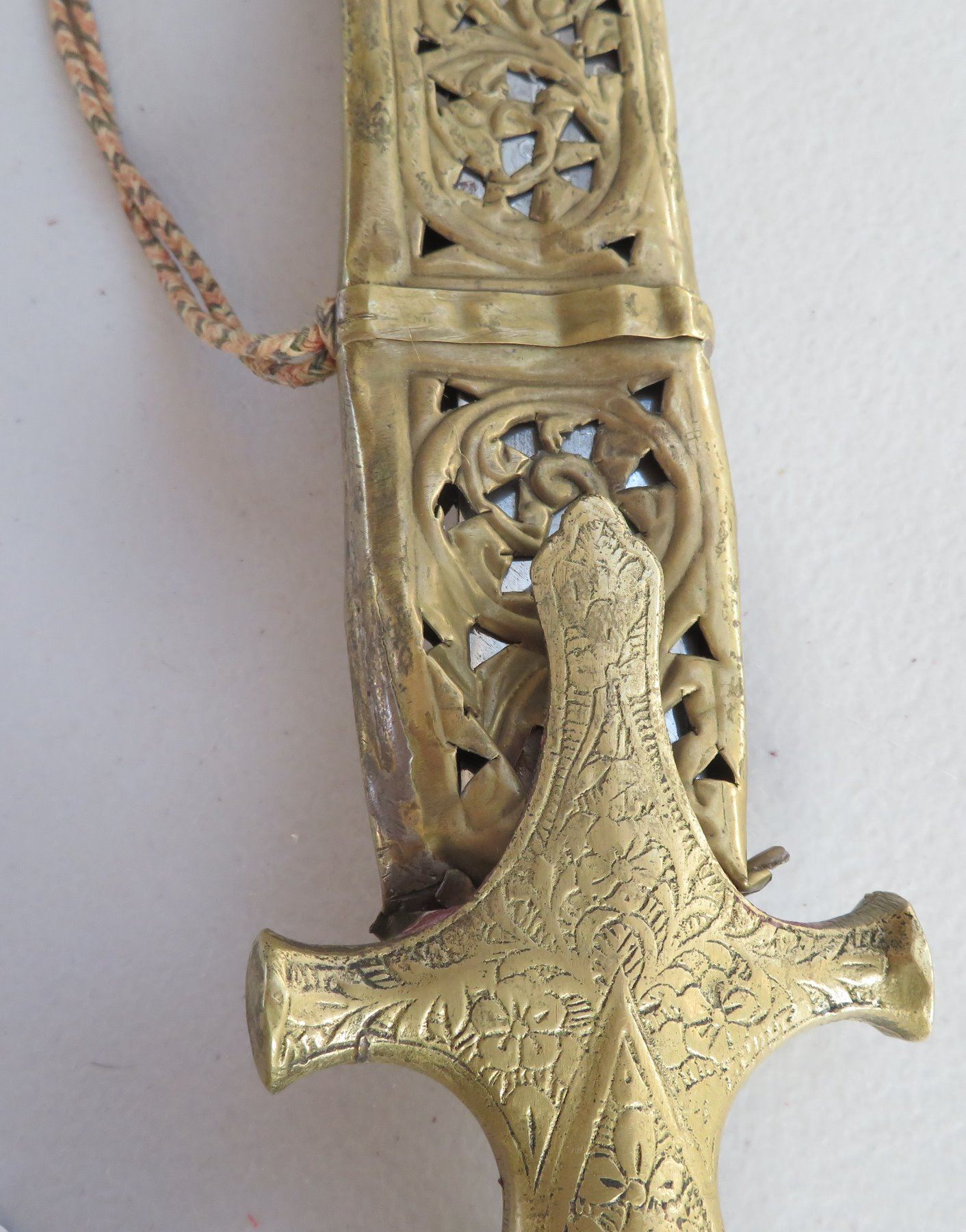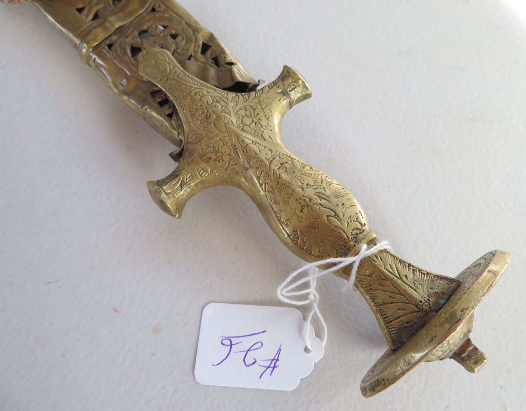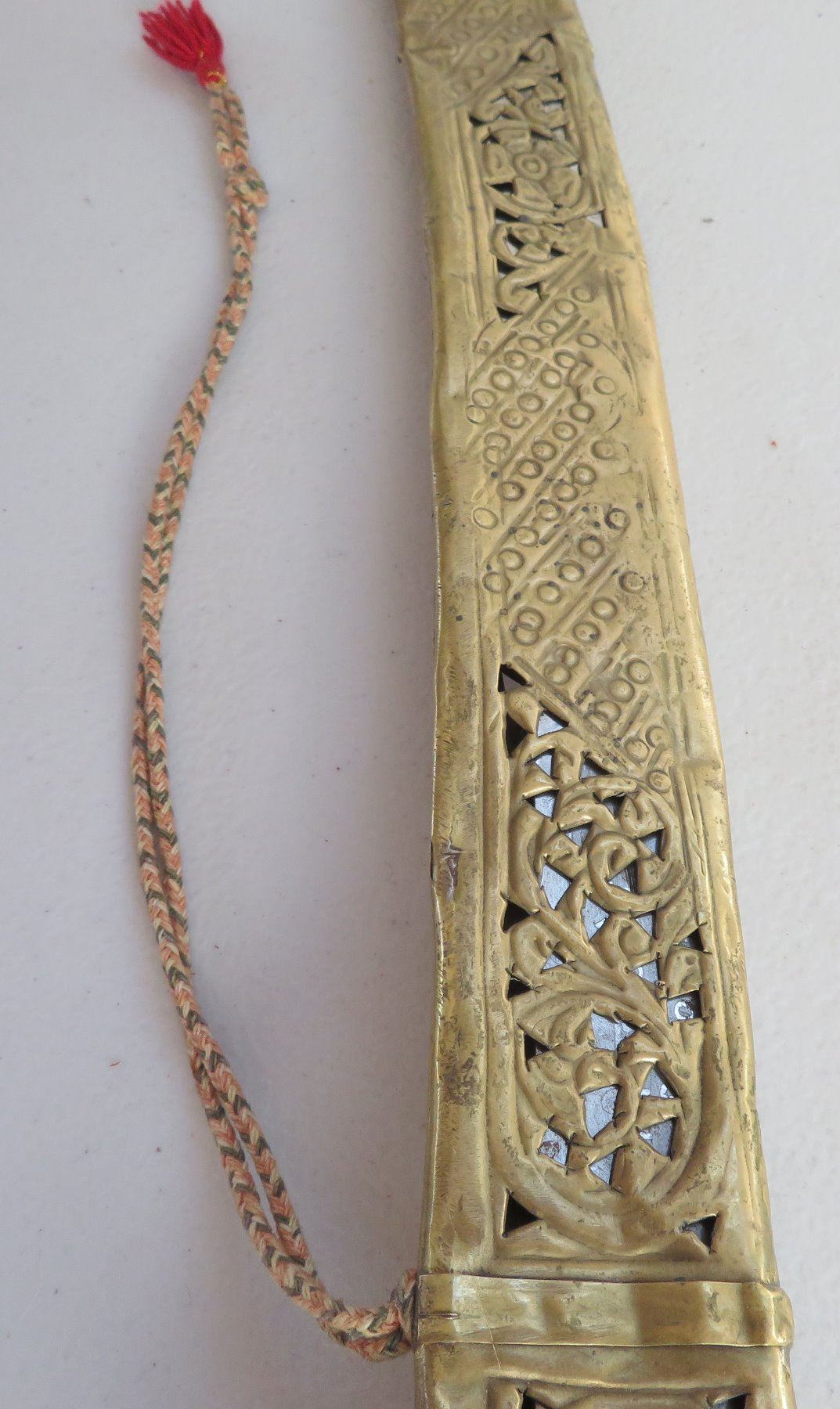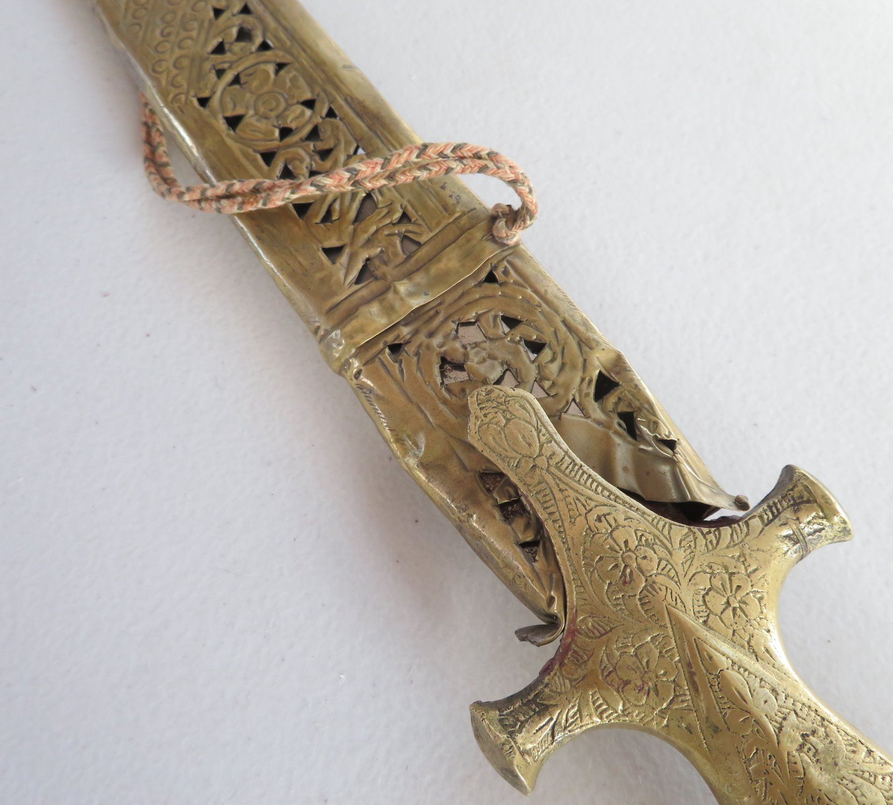 Turkish Dress Sword, c. 1900. Made of brass scabbard and steel blade, the item measures 34" x 3". Writing on blade. Southern Turkey. Condition: Scabbard damaged, bends nicks and wear, see images. Shipping: $55.00 USA estimate only, due to length and weight.