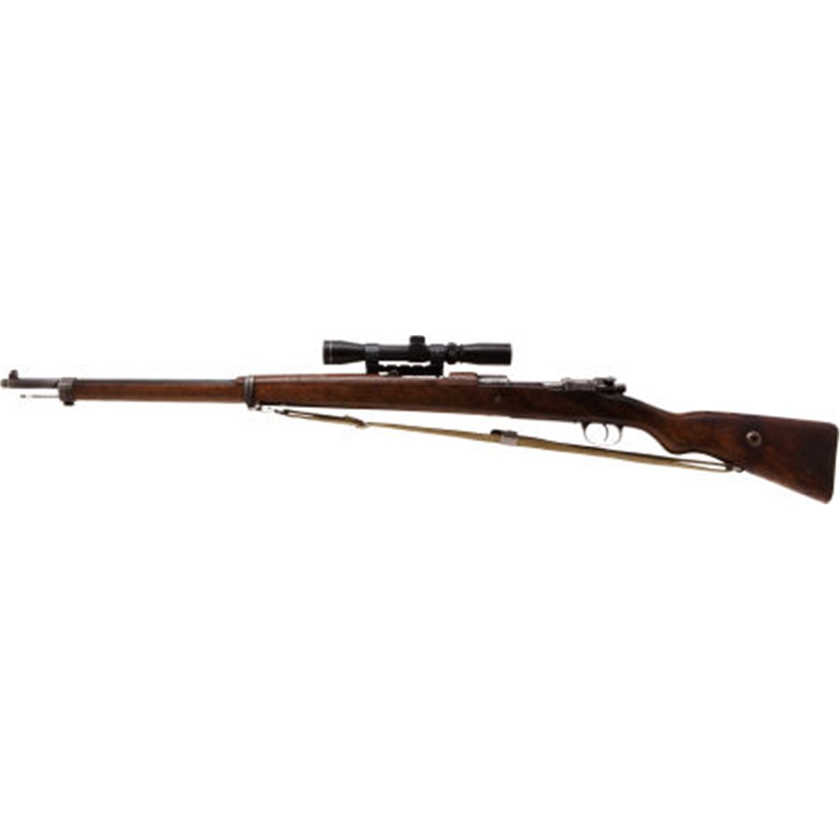 Turkish Gewehr 98 Mauser Bolt Action Rifle. Serial no. 143544, 8mm, 30-inch barrel with standard front sight and mounted with Target Sports 2-7 X 32 telescopic sight. Import stamps. Straight bolt toggle. Walnut stock and armguard. Sling mounts. Web sling. Condition: Good. Grey metal with age patina. Custom telescopic sight. Wood with wear and marks. Action good. NRA FIREARMS FOR FREEDOM PROGRAM