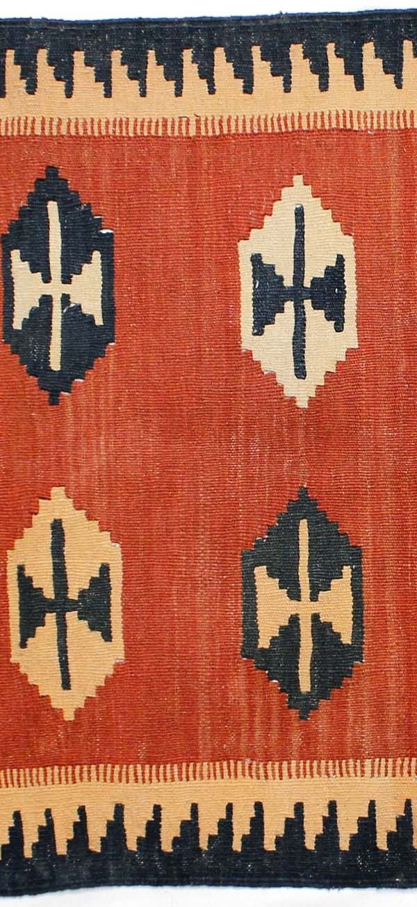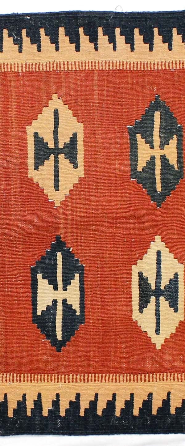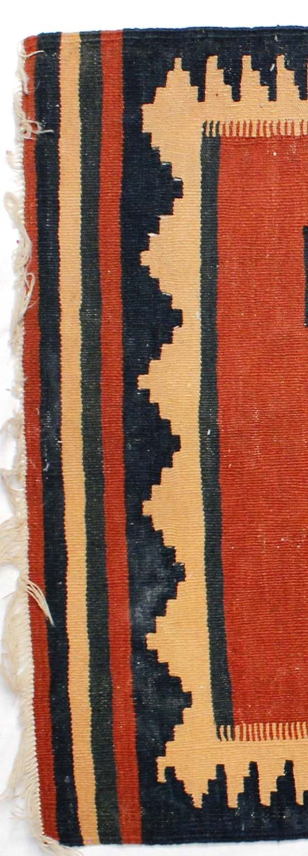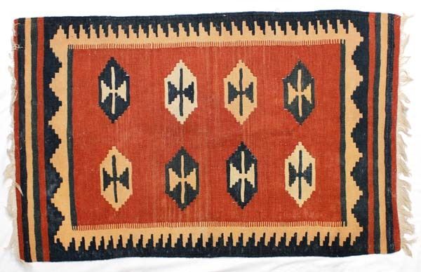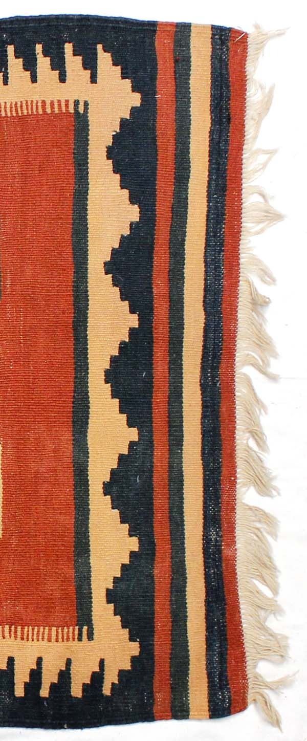 Turkish Kilim Textile Rug. Fringe is 2'' long with some minor damage. Measures 60'' x 65''