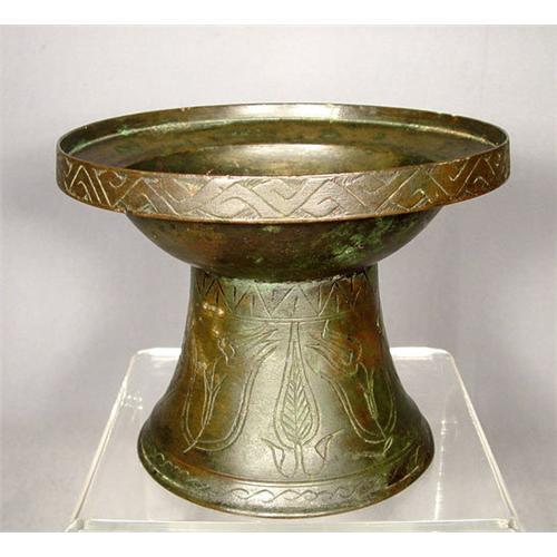 Antique, 16th -17th century Turkish Ottoman incense-burner/ Polycandelon. DETAILS: made of cast and wheel turned bronze, shallow bowl with the rim engraved with a two interlacing zig-zag bands, mounted on splayed conical base chisel with tulips, medallions and Cyprus trees. Height: 12,5 cm (4 7/8 in). Width: 16cm (6 ¼ inches). Condition: in good condition with beautiful green patina except for a minor crack in the base. Reference: Tulips, Arabesques & Turbans: Decorative Arts from the Ottoman Empire. Edited by Petsopoulos
