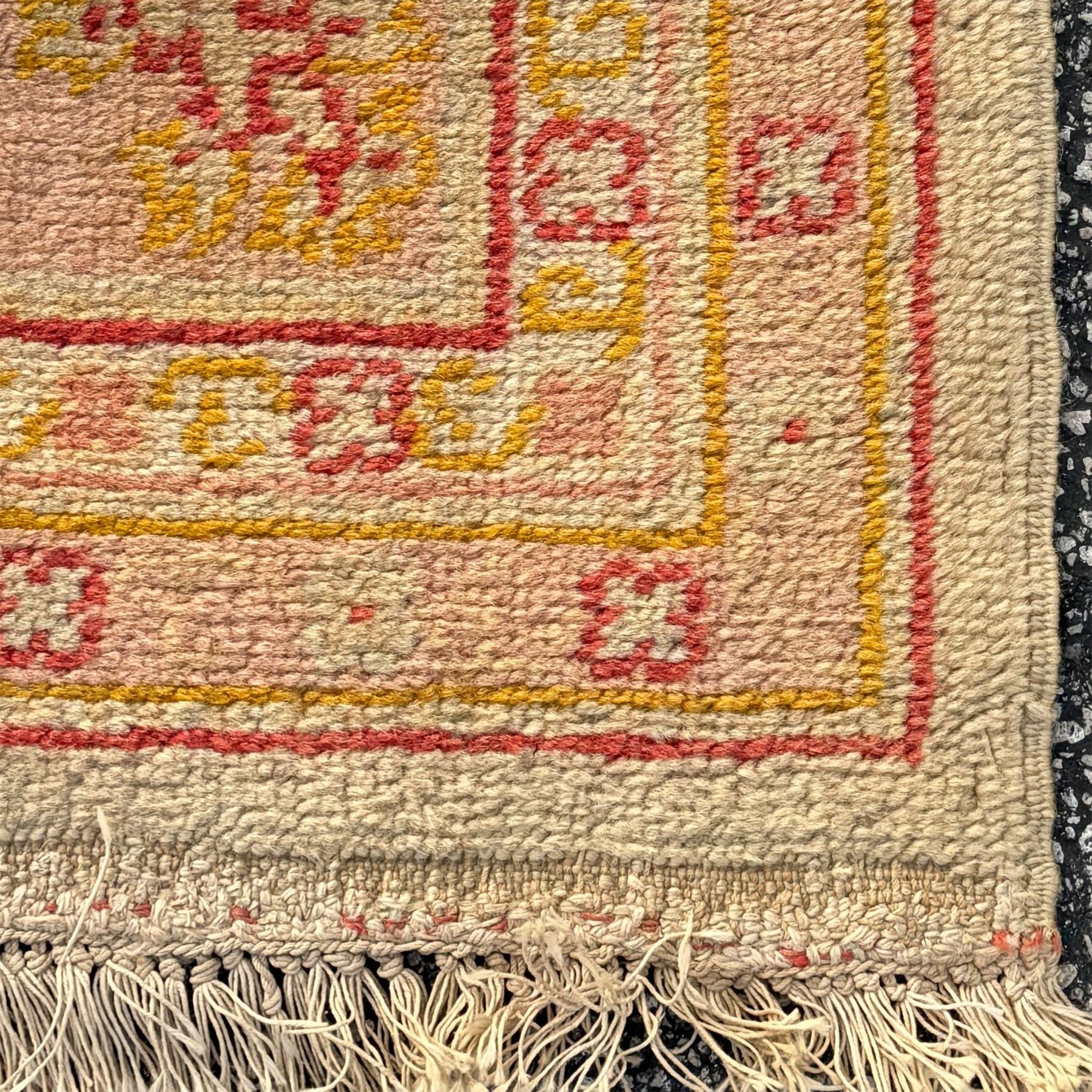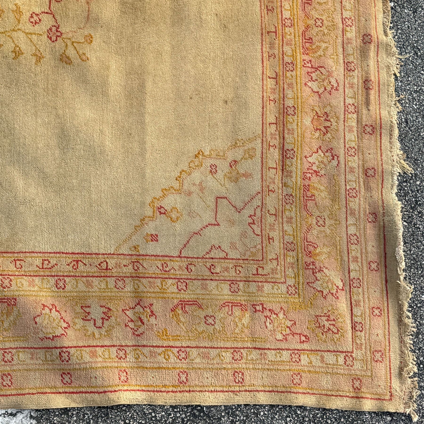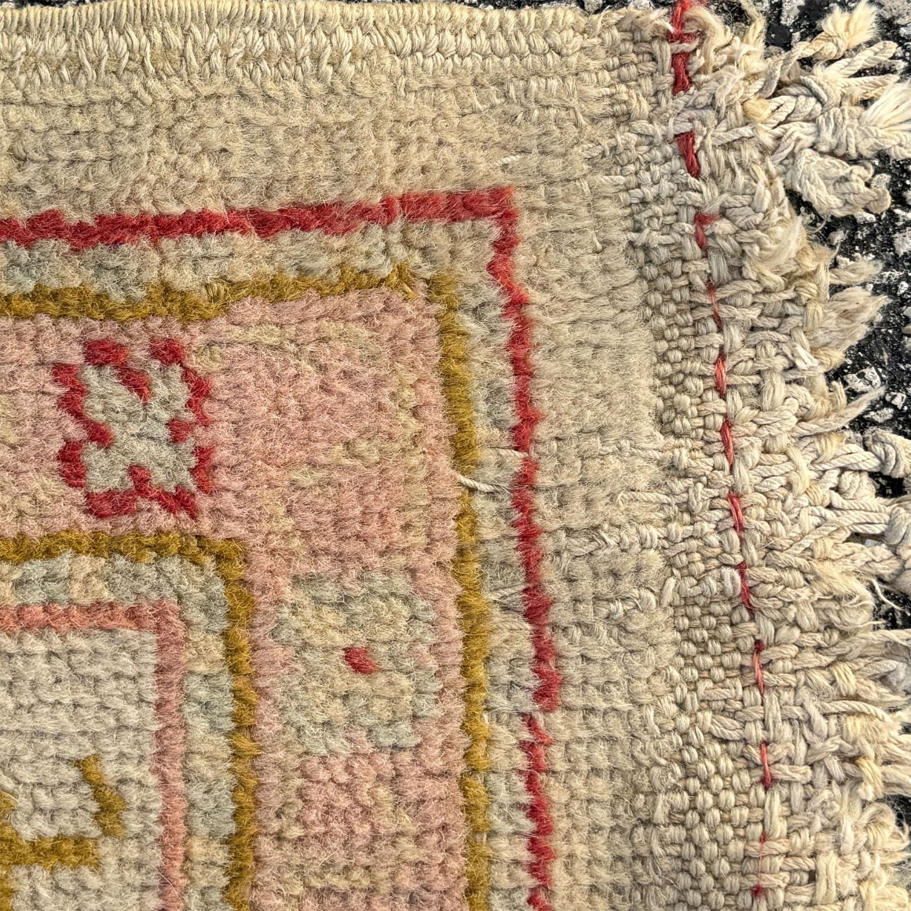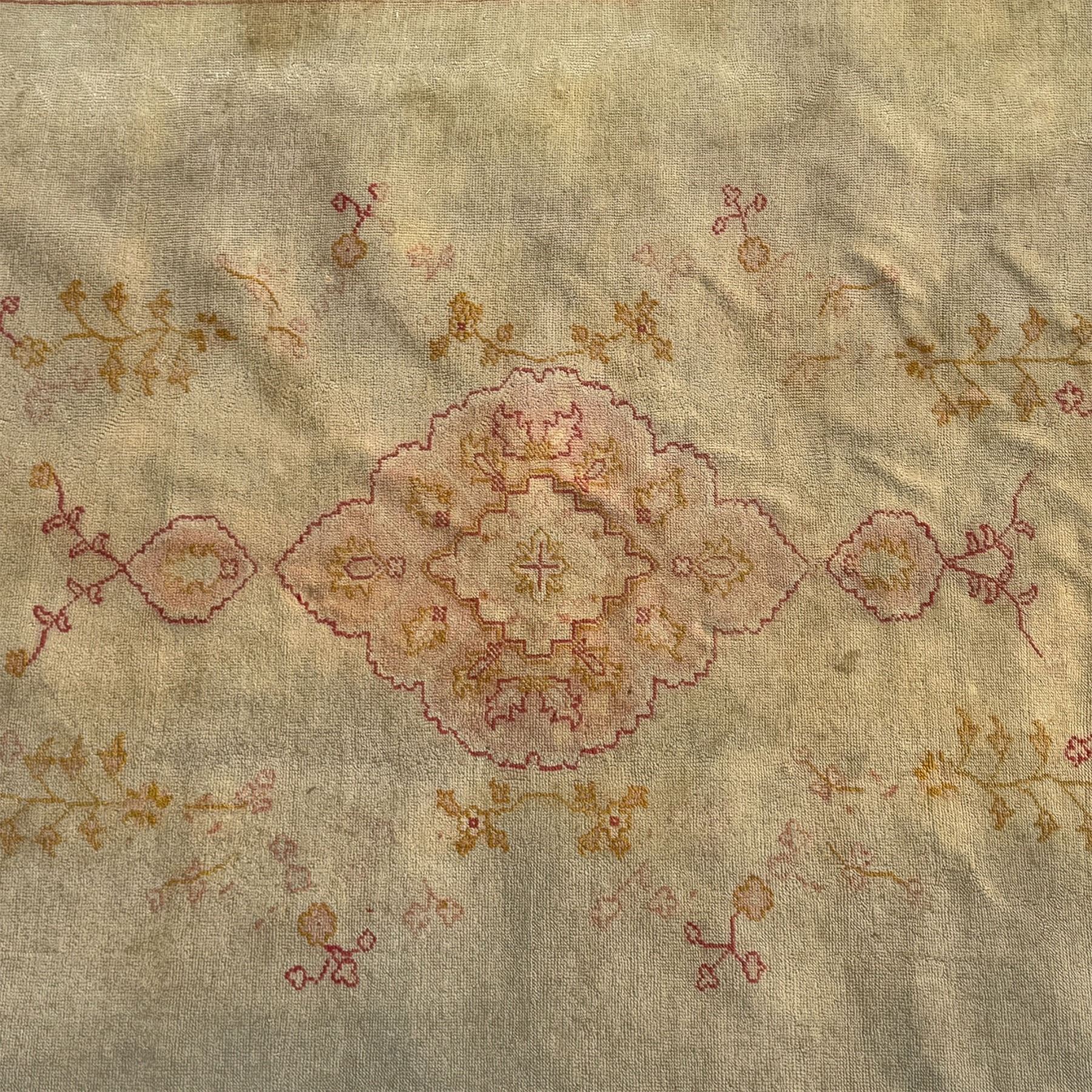 A large white rug featuring pink and yellow accented floral artwork, with delicate linework that comes together to create a beautiful, vibrant flower imagery.