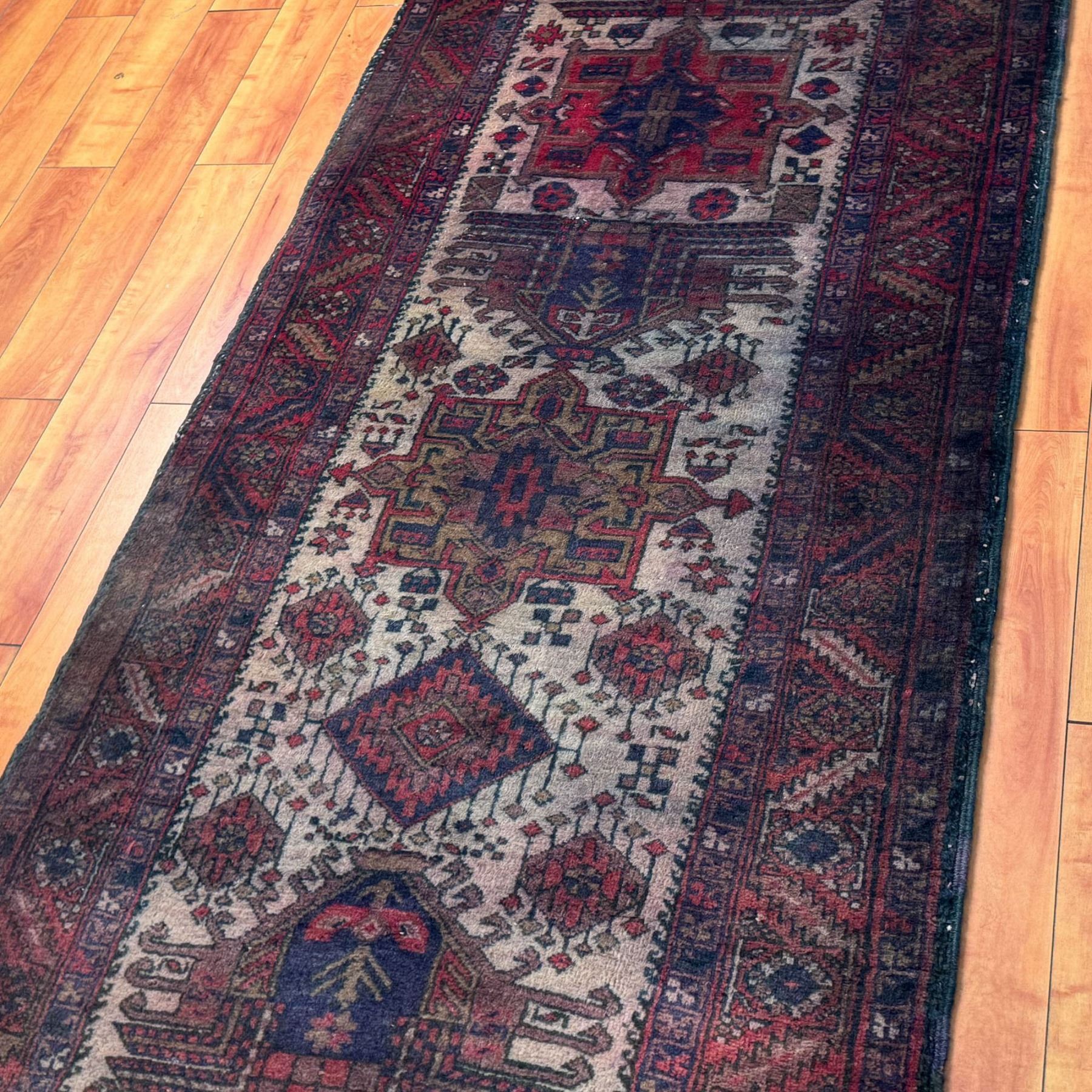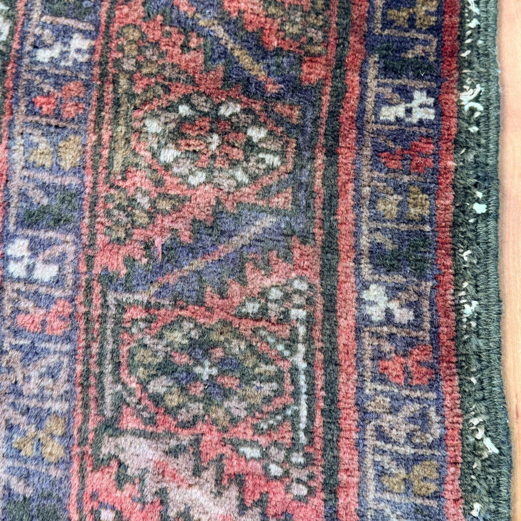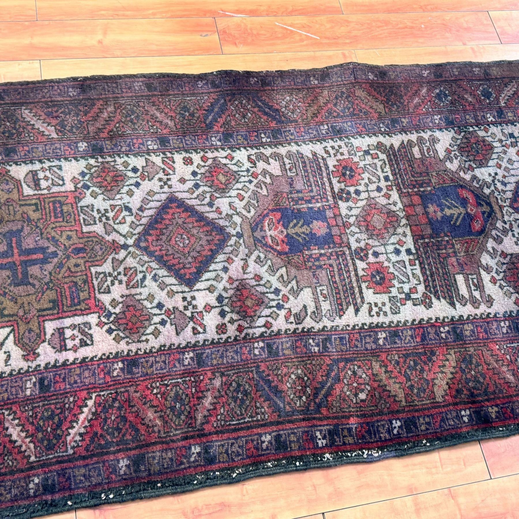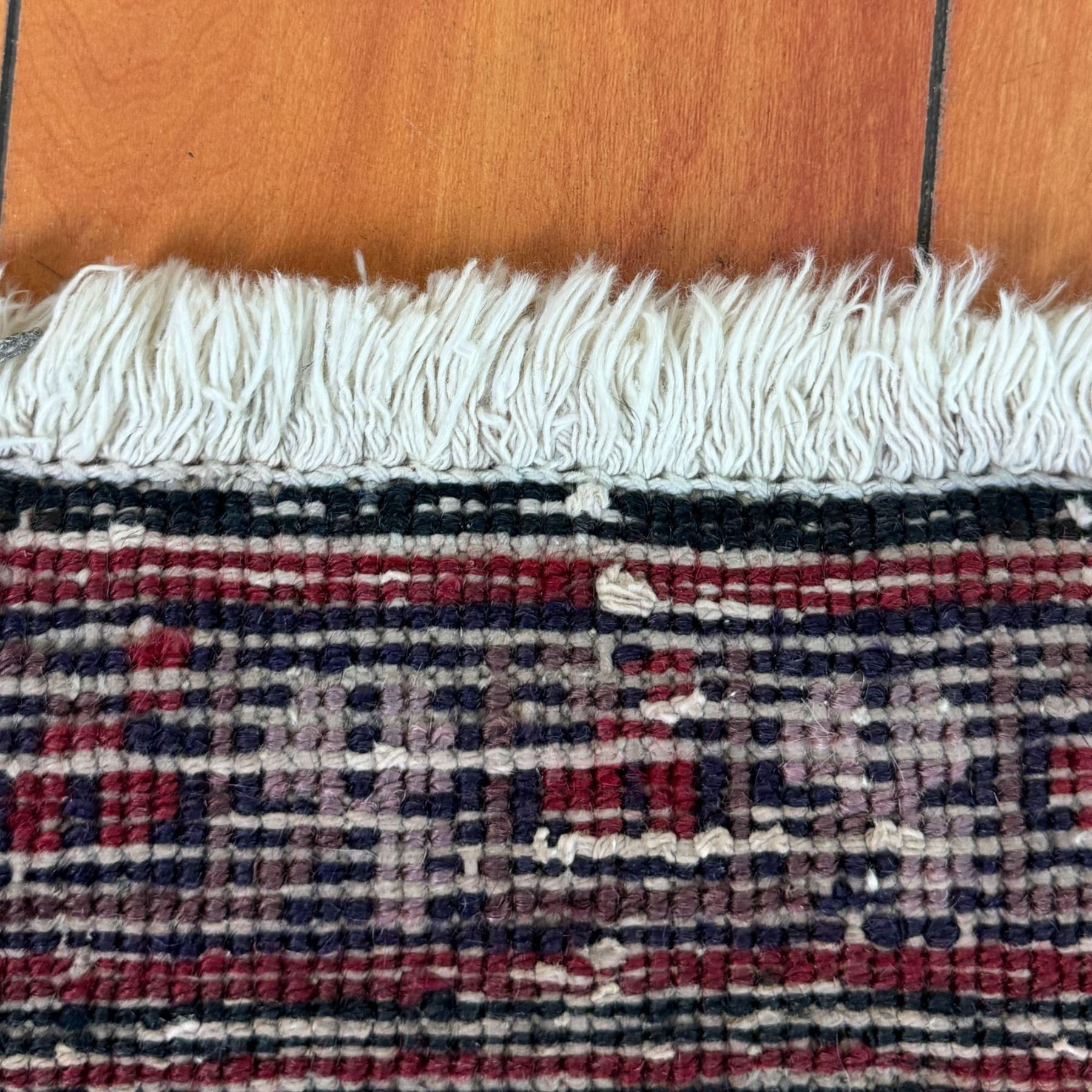 A long red, black, and brown rug featuring a captivating array of shapes, including snowflakes, squares, staircases, and more, woven together to create a mesmerizing tapestry of design.