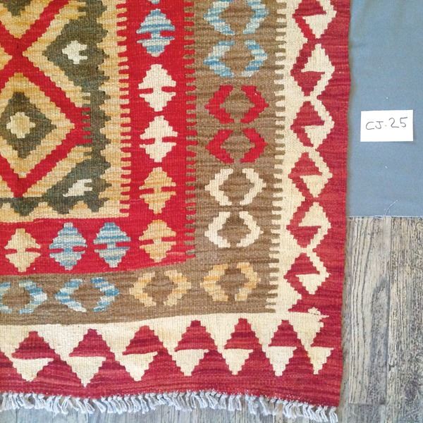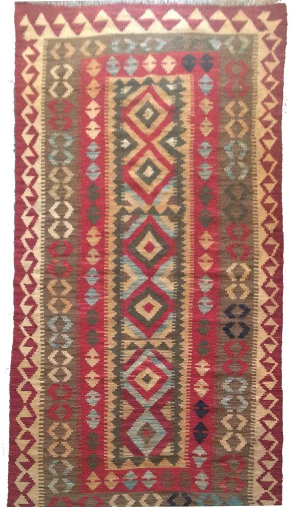 Runner shaped, hand woven, all wool Kilim rug/carpet with traditional geometric motif and fringed ends. Good condition.Mid 1900s82" x 40"