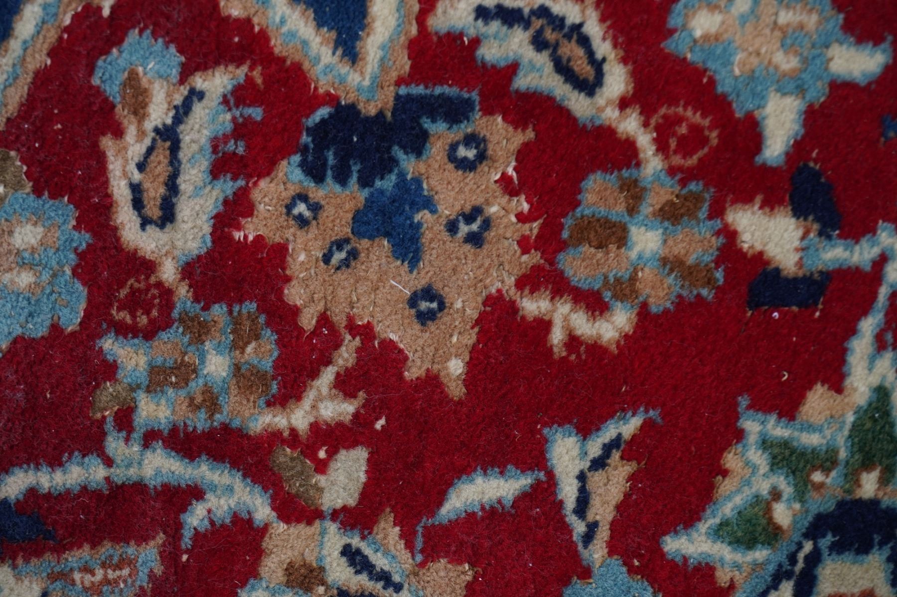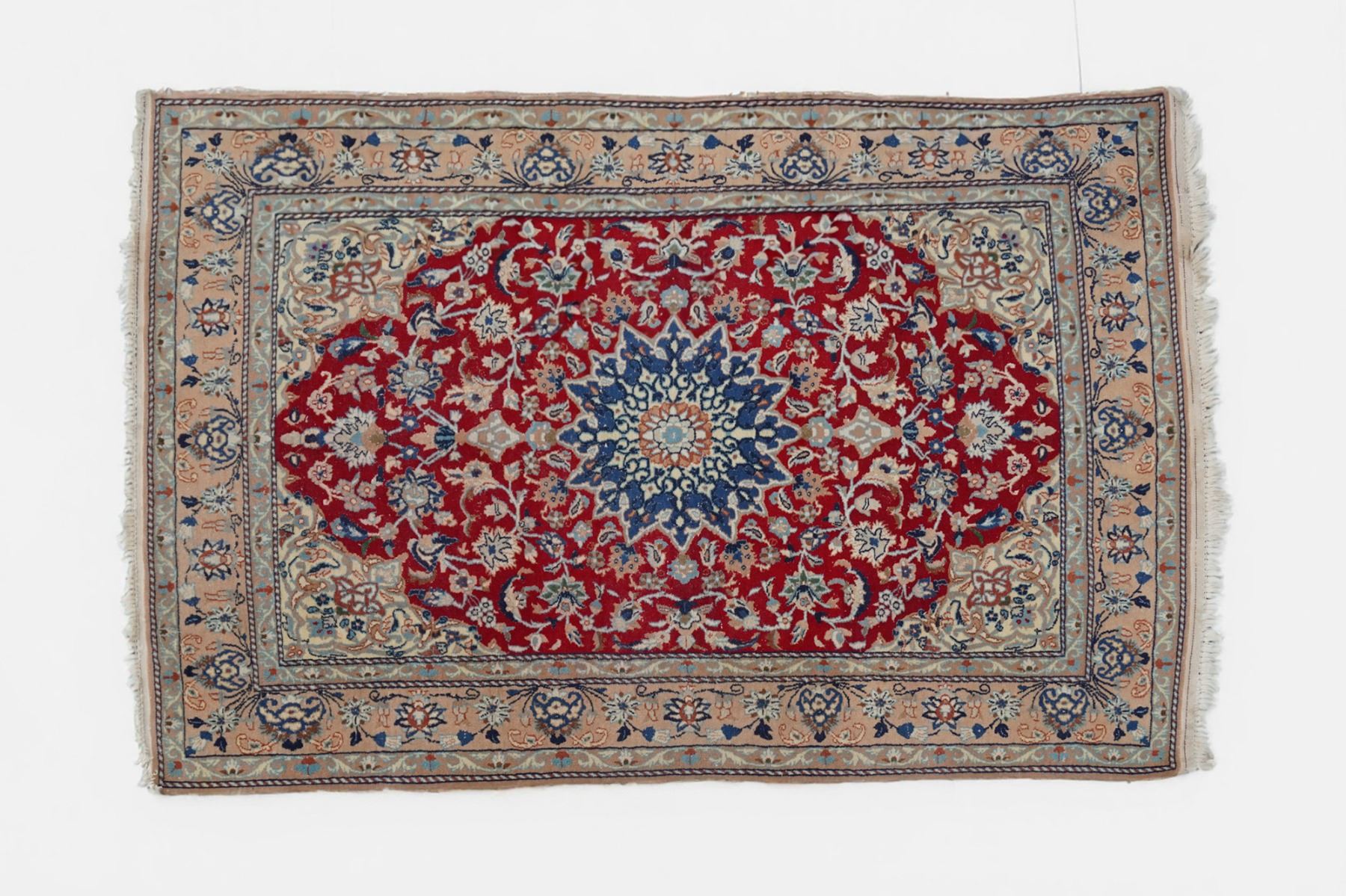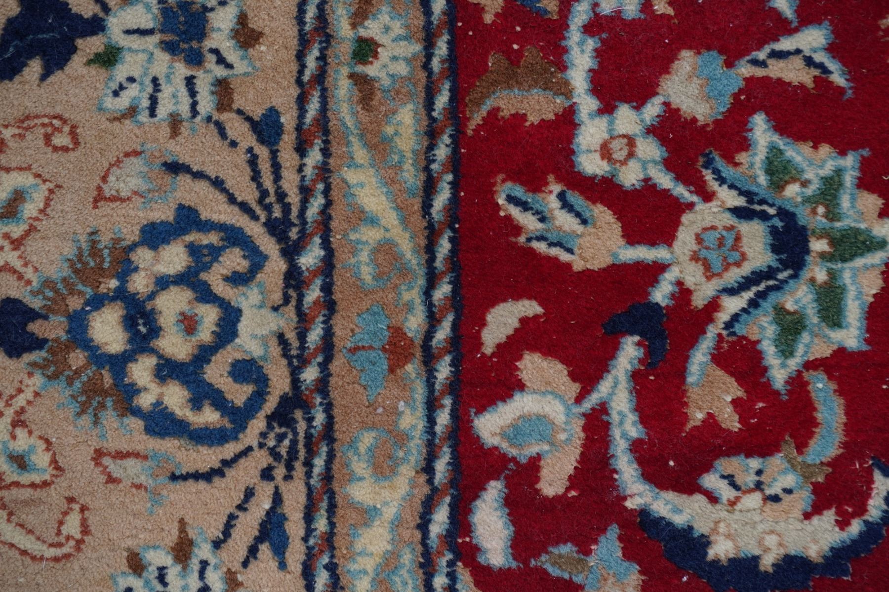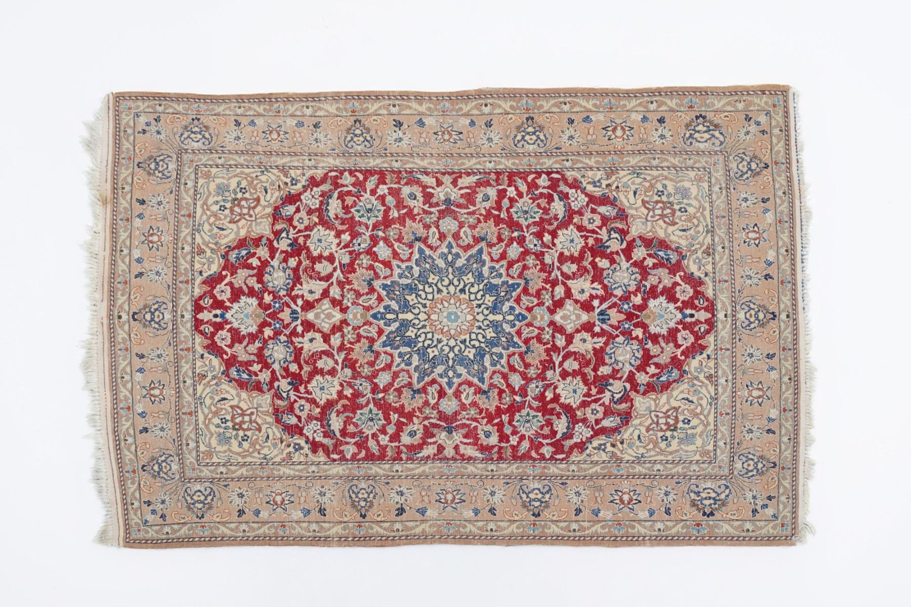 A finely hand-knotted Turkish wool rug in the Persian style featuring a radiant central star medallion in shades of indigo and ivory, framed by an intricate floral field of rich crimson accented with celadon, beige, and sky blue motifs. The harmonious border exhibits traditional palmettes and tendrils on a soft sand ground, lending elegance and balance to the composition. The craftsmanship reveals tight knotting, crisp detail, and a pleasing sheen from the natural wool pile, with subtle abrash that enhances its authenticity and depth. A superb decorative carpet ideal for a collector or refined interior.