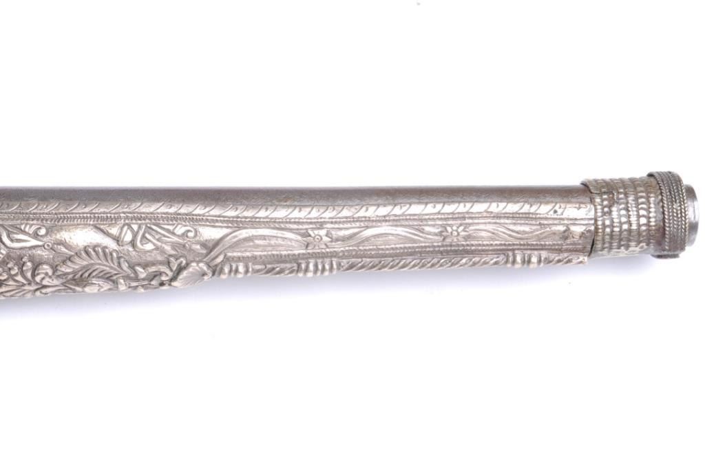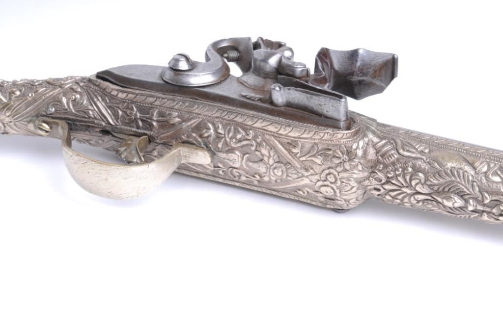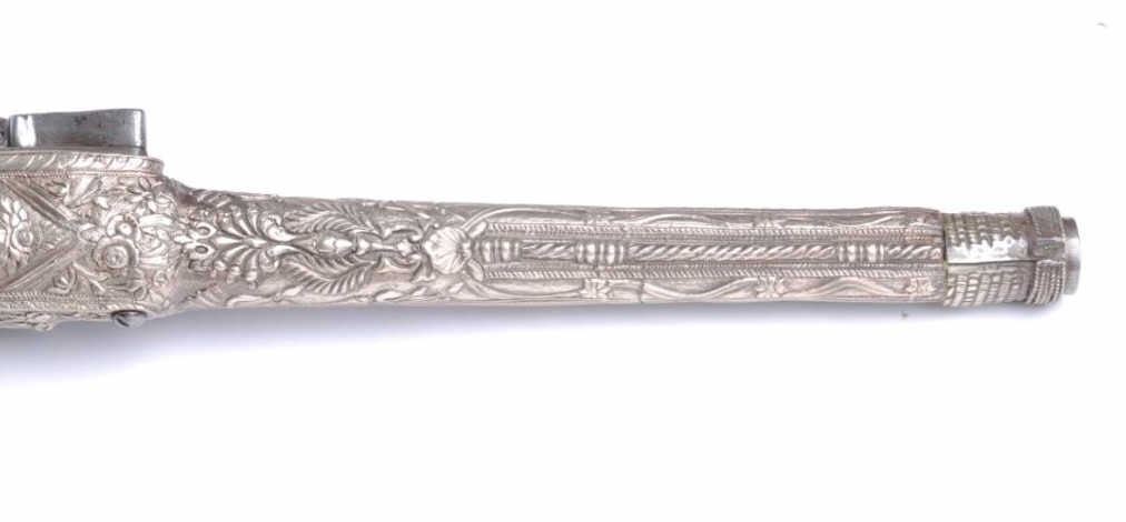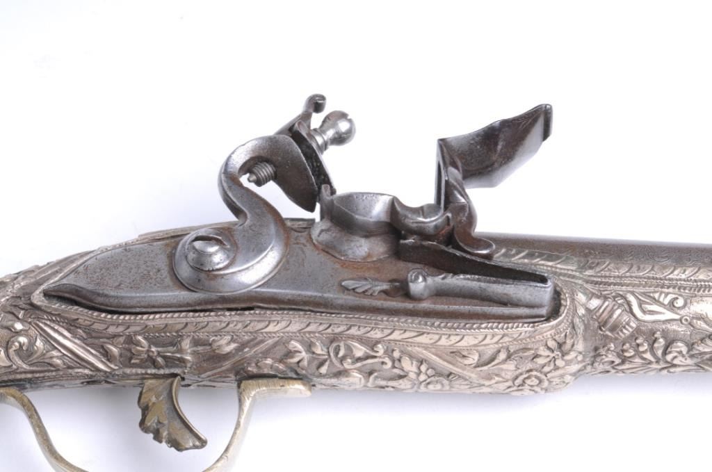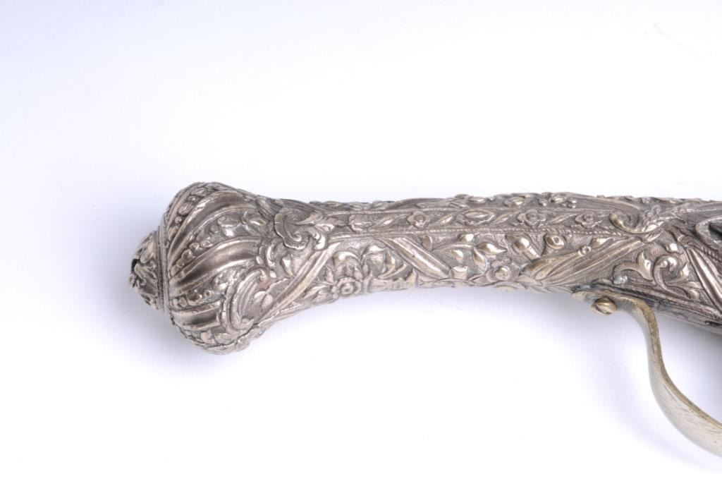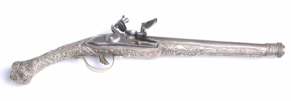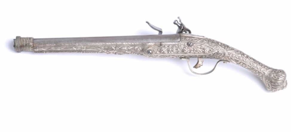 Turkish or Balkan flintlock Chieftan’s grade pistol with fancy cast silver stock circa early to mid-19th century. Measures 18” overall with a 11” barrel of approximately .60 caliber smoothbore. Shows exceptional work in the stock and qualityoverall. (Antique) Est.: $800-$1600