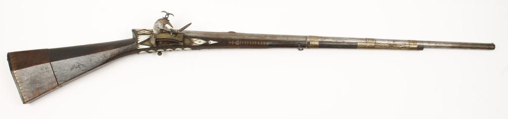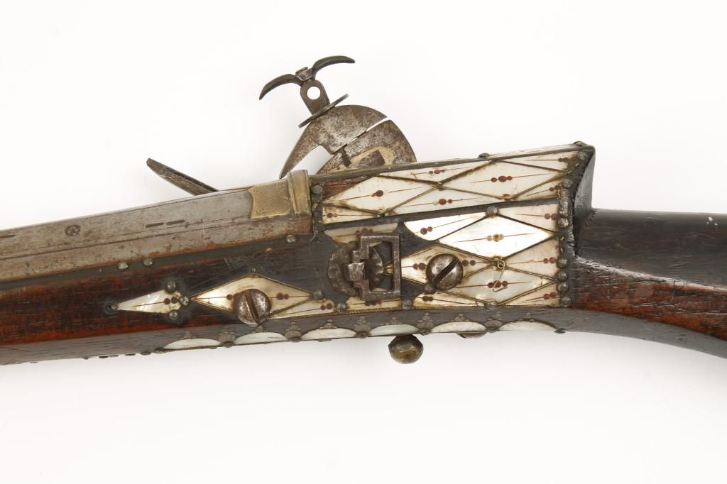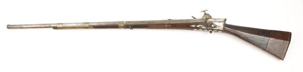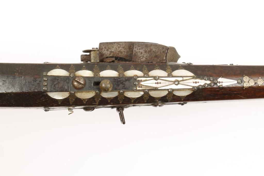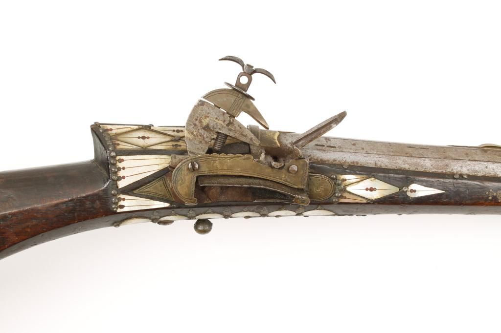 Turkish or Caucasian miquelet flintlock carbine with pearl and brass inlaid stock circa 18th to 19th century. The gun measures 46” overall with a 32” barrel of approximately .62 caliber smoothbore. Thebarrel shows a stamped maker or armorers type mark near the left side of the breech. The stock is nicely inlaid with pearl, brass wire, small circular brass pierced inlays and studs very much in the Turkish style. Thebutt plate is constructed of dark horn and the condition is good to very good overall with some small losses of wire inlays and minor imperfections. Est.: $600-$1,200.