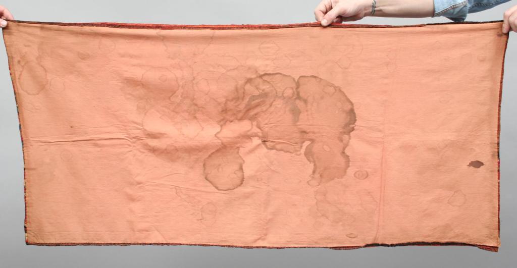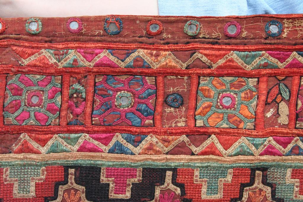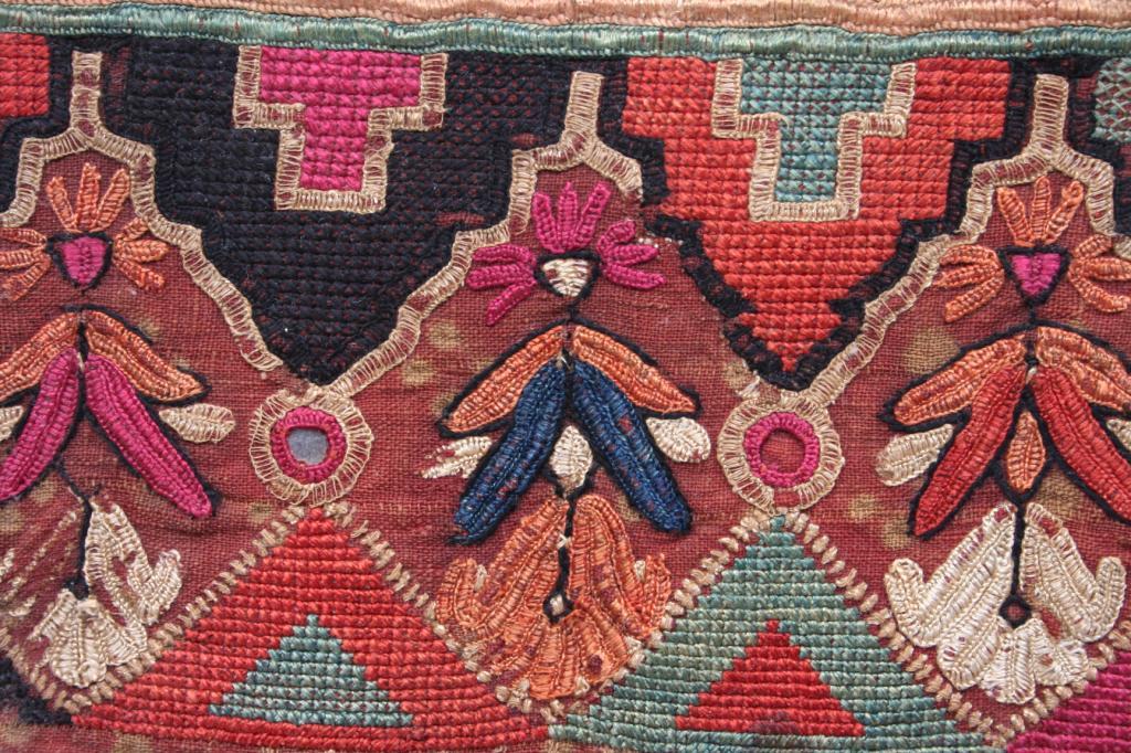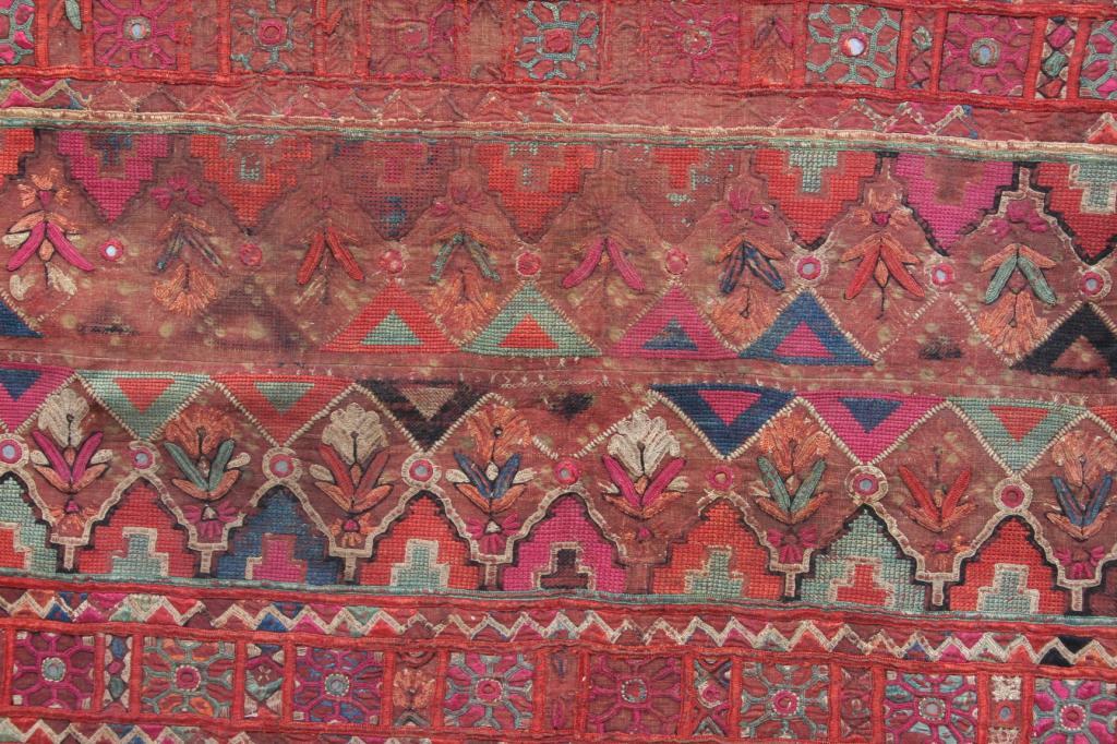 Late 19th or early 20th century, embroidered in a stylized floral motif in iron red, green, beige, persimmon, and brown, inset with small reflective metal pieces. 48" x 22 1/2". Condition: some losses to needlework along border and center, stains to verso.