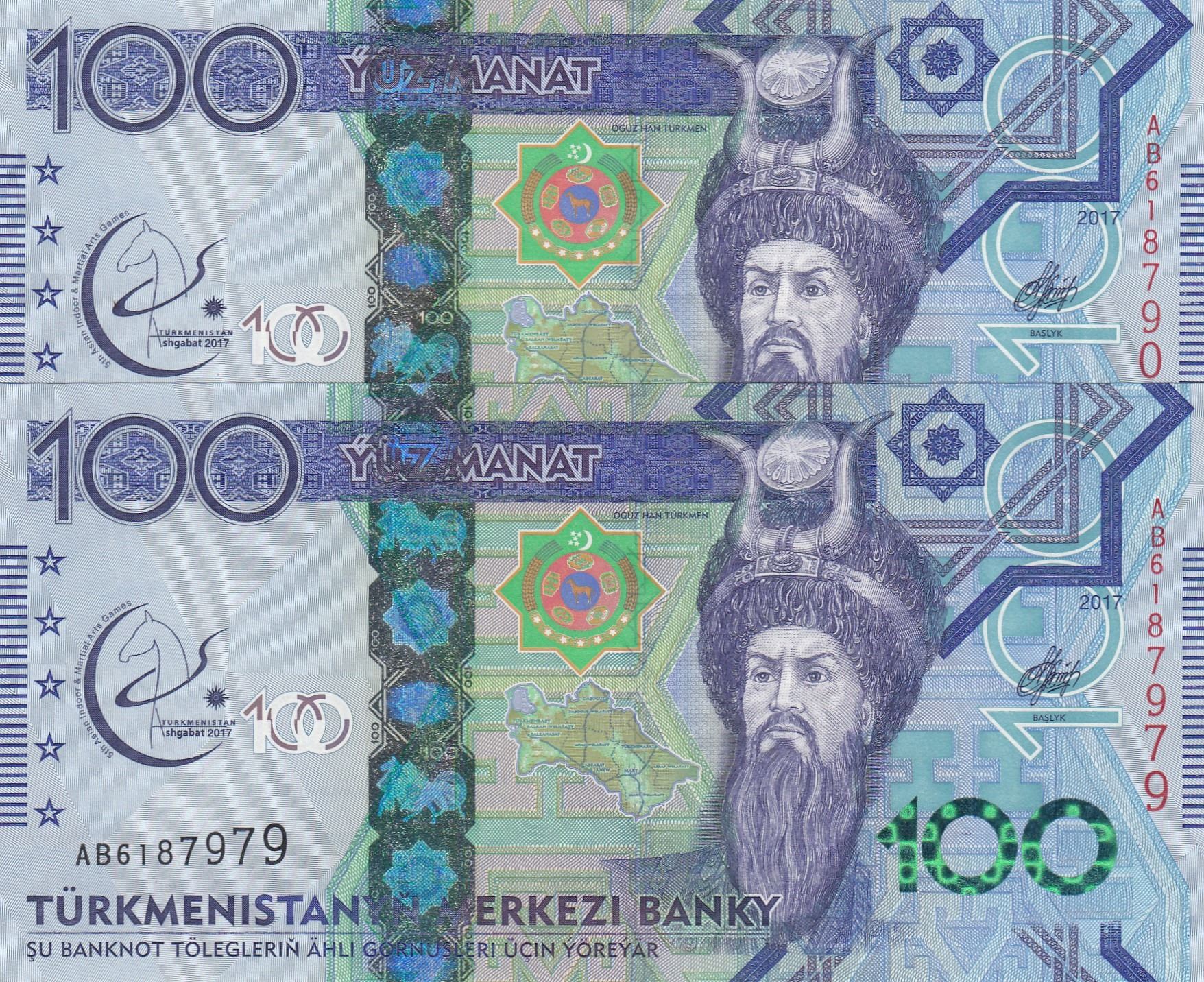 Turkmenistan, 100 Manat, 2017, UNC, p41, (Total 2 banknotes)br/Commemorative Issue, serial numbers: B 6187902 and AB 6187979