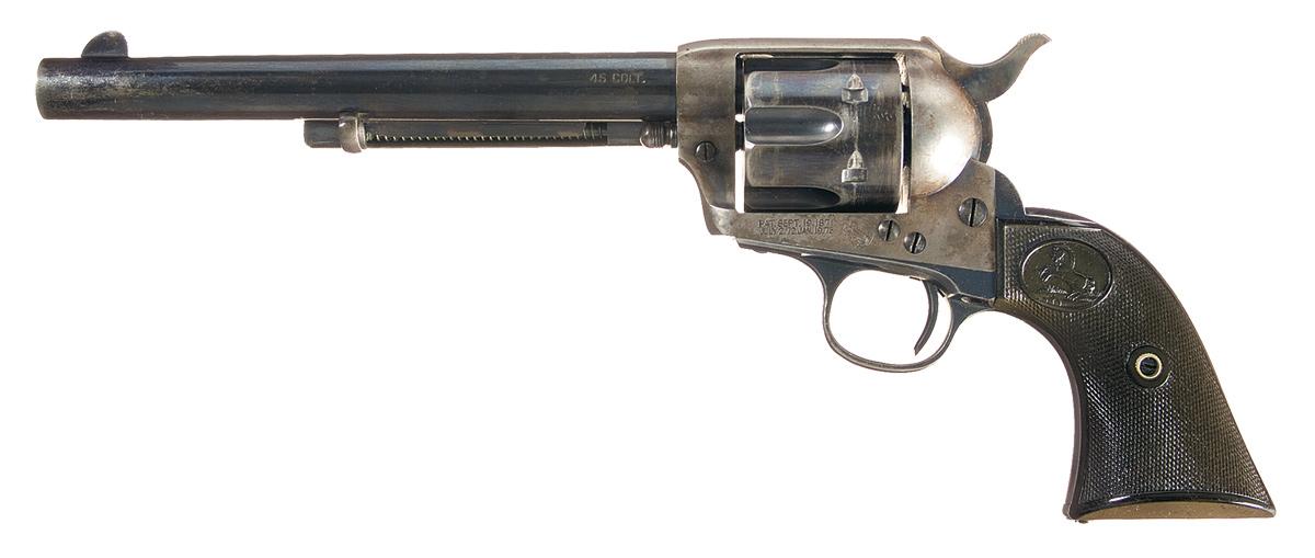 Colt Single Action Army revolver manufactured in 1899. The revolver has the 'smokeless powder frame' introduced about serial number 180,000 and transverse cylinder pin. The revolver has a high polish, commercial blue, barrel, cylinder, trigger guard and backstrap and casehardened frame, loading gate and hammer. The hammer has short, borderless, fine knurling on the spur with no underlying slash below the knurling. The two-piece, black, hard rubber, stocks are checkered and have the Rampant Colt trademark in an oval at the top. The top of the barrel is roll-stamped: "COLT'S PT. F.A. MFG. Co. HARTFORD. CT. U.S.A.-" in one line. "45 COLT." is roll-stamped on the left side of the barrel and the caliber designation "45" is stamped on the bottom of the barrel in front of the frame. The left side of the frame is roll-stamped with the Colt 'three-date/two-line' patent markings followed by the encircled Rampant Colt trademark. The loading gate is stamped with the assembly number "804" and the cylinder is not marked. The serial number, "187079" is stamped on the bottom of the frame, trigger guard and backstrap. All of the visible serial numbers match. The number "10" is neatly stamped on the bottom of the backstrap behind the serial number. The significance of this non-factory marking is unknown. "XXX" is lightly scratched on the inside of both stocks; this appears to be a factory assembly mark. The right rear trigger guard has a factory rework mark which writer believes to be the explanation for the later production hammer being present on the revolver as everything else is original.