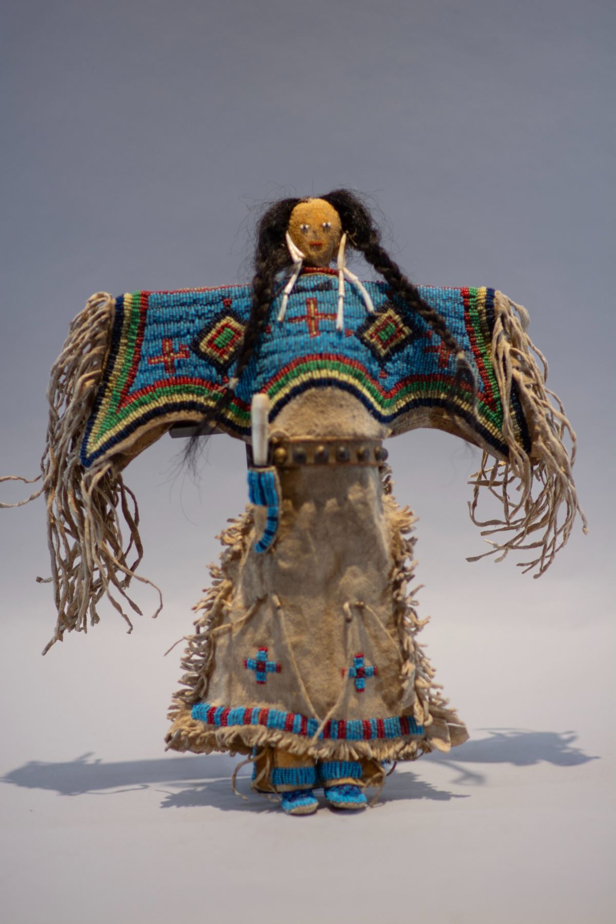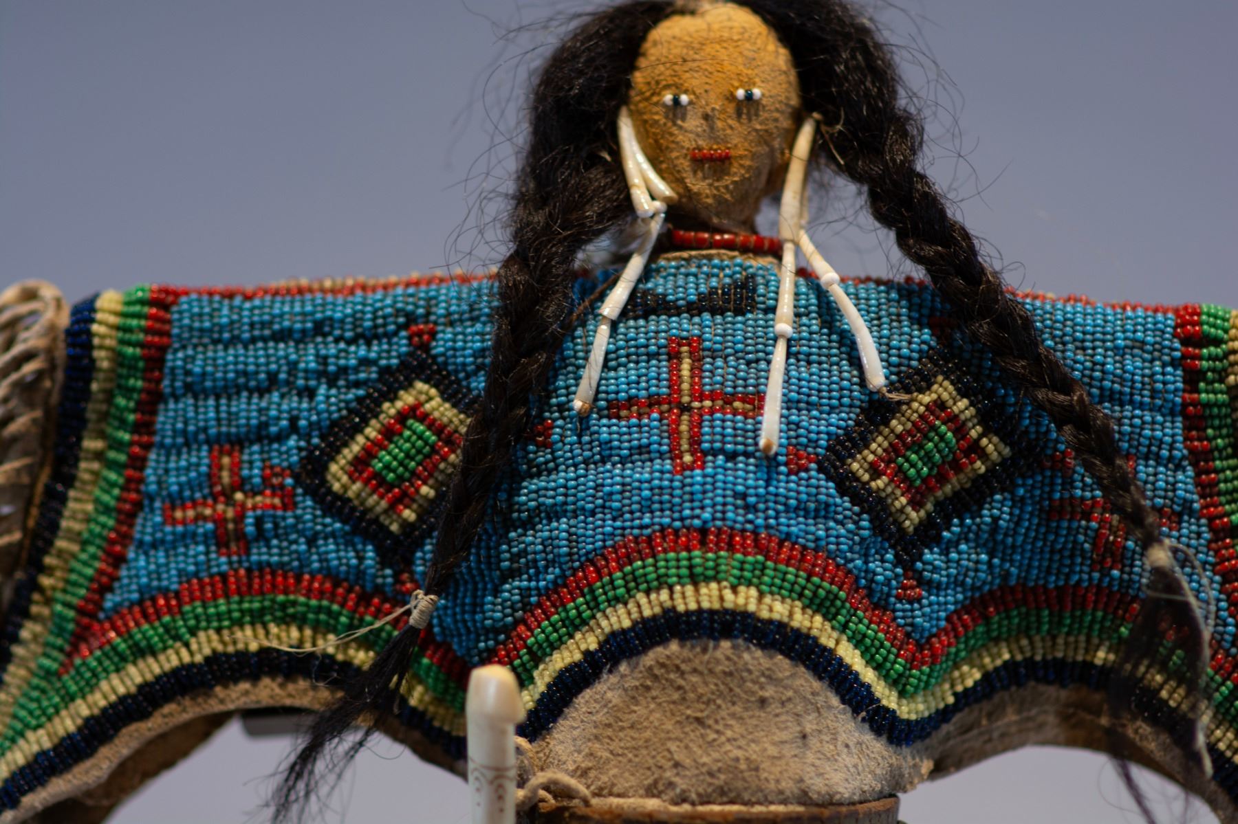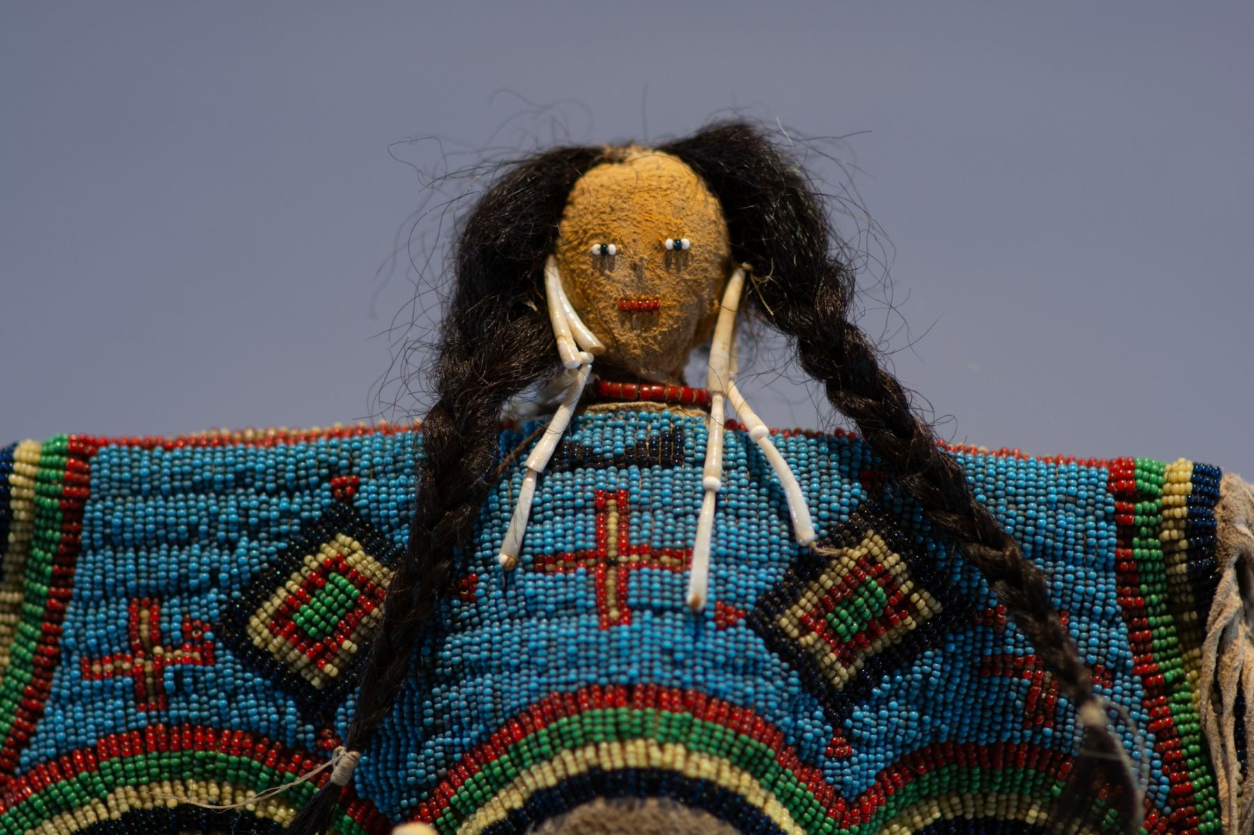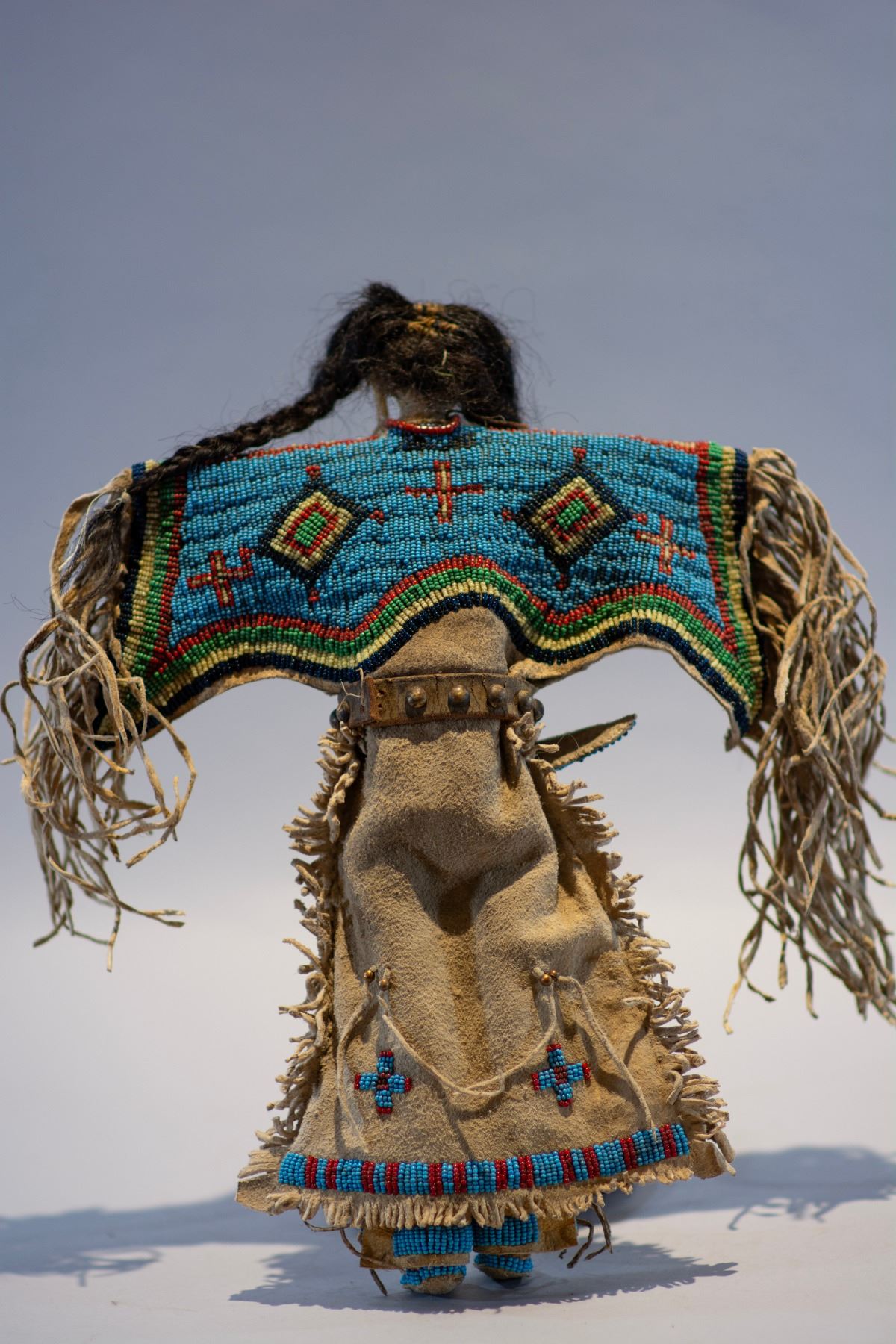 An exceptional and finely crafted Sioux beaded doll, dating from the late 19th to early 20th century. This exquisite piece of Native American art features intricate detail and superior craftsmanship, making it a highly desirable collectible. The doll's attire is a testament to the maker's skill, from the carefully prepared brain-tanned hide to the complex geometric beadwork. The doll's dress is made of soft hide and adorned with geometric beadwork and long fringe. The doll wears a leather belt with tacks and a beaded knife sheath. A miniature, detachable knife with a bone handle is included and fits into the sheath.