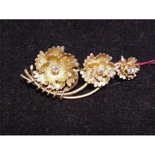 Wonderful Turn of the Century Circa 1900 Diamond and 14Kt Yellow gold three flower brooch set with three small Old European Cut diamonds one in each flower centrally set swirling stem bar brooch. Reverse: lever catch, flange hinge. Great condition.