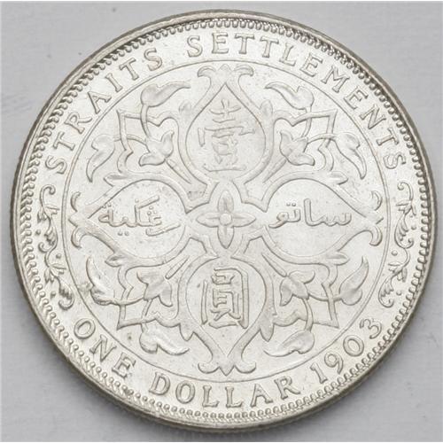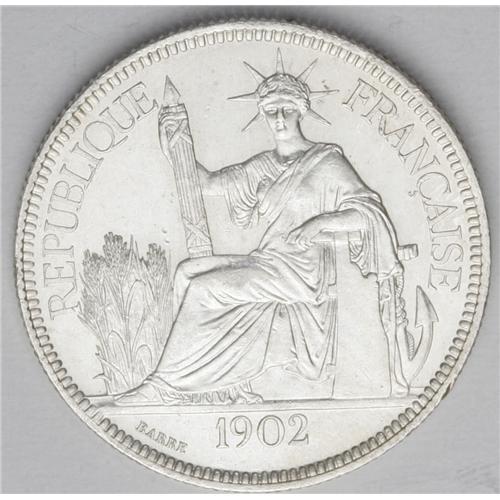 <B>Turn of the Century "Asian" Crowns: </B></I>French Indo-China 1902-A Piastre, KM5a.1, Brilliant AU-Unc., together with Straits Settlements 1903-B (incuse) Dollar, KM25, frosty BU, usual marks.