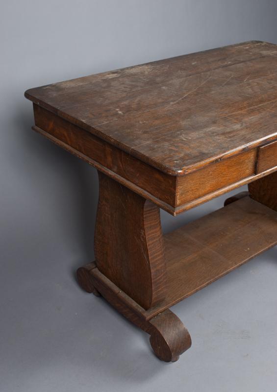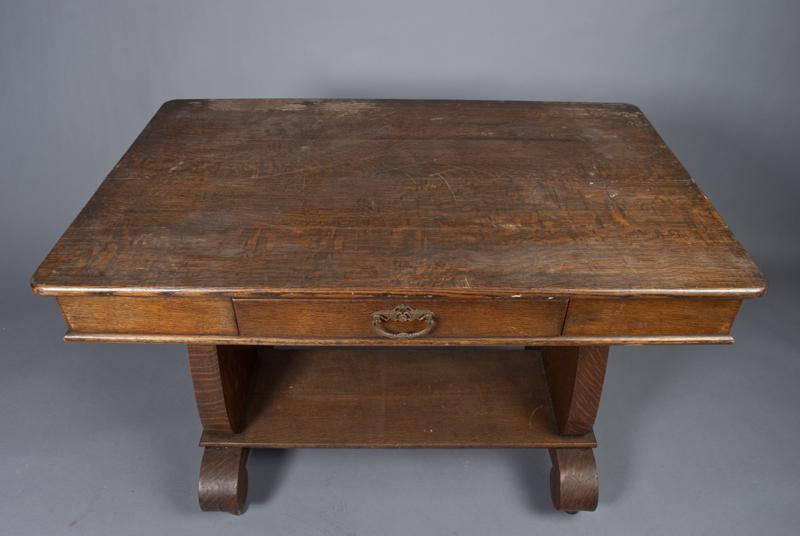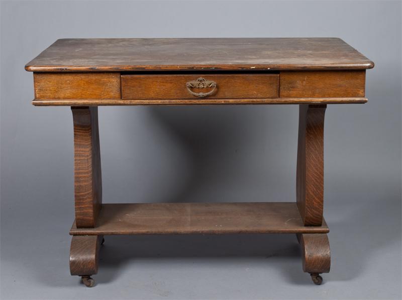 With scrolled feet, single drawer, on castors. 30.25" H x 41.75" W x 26.5" D. Wear to varnish on top, otherwise very good condition.