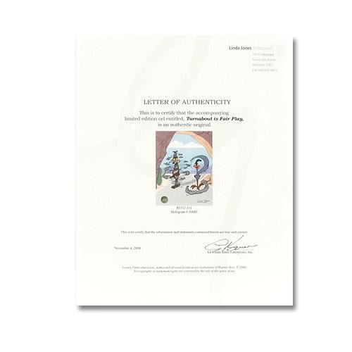 Own this amazing piece based on the original line image hand drawn and hand-inked on paper by Chuck Jones (1912-2002)! "Turnabout is Fair Play" is a sold out limited edition animation cel with Hand Painted Coloring on sericel outline, numbered and hand signed by Chuck Jones. Includes Certificate of Authenticity! Measures approx. 13.5" x 16.5".