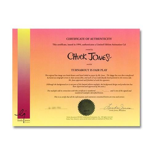 Own this amazing piece based on the original line image hand drawn and hand-inked on paper by Chuck Jones! "Turnabout is Fair Play" is a limited edition animation cel from a sold out edition with hand painted coloring on sericel outline, AP numbered and hand signed by Chuck Jones (1912-2002). Includes Certificate of Authenticity! Measures approx. 13.5" x 16.5" (image).