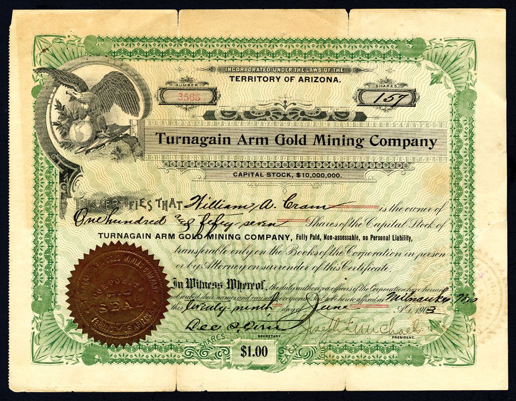 Alaska, 1903, 157 Shares, I/U stock certificate, Green border with Eagle on UL, Gold Company seal, VG condition with toning and small fold splits on edges. Mines probably located in the Hope-Sunrise area on the Turnagain Arm side of the Kenai Peninsula, where gold was discovered in 1895. This area is not far from the very first discovery of gold in Alaska by the Russians in 1849. Scarce Alaska mining stock.