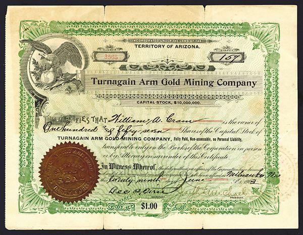 Alaska, 1903, 157 Shares, I/U stock certificate, Green border with Eagle on UL, Gold Company seal, VG condition with toning and small fold splits on edges. Mines probably located in the Hope-Sunrise area on the Turnagain Arm side of the Kenai Peninsula, where gold was discovered in 1895. This area is not far from the very first discovery of gold in Alaska by the Russians in 1849. Scarce Alaska mining stock.