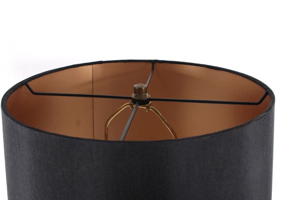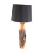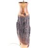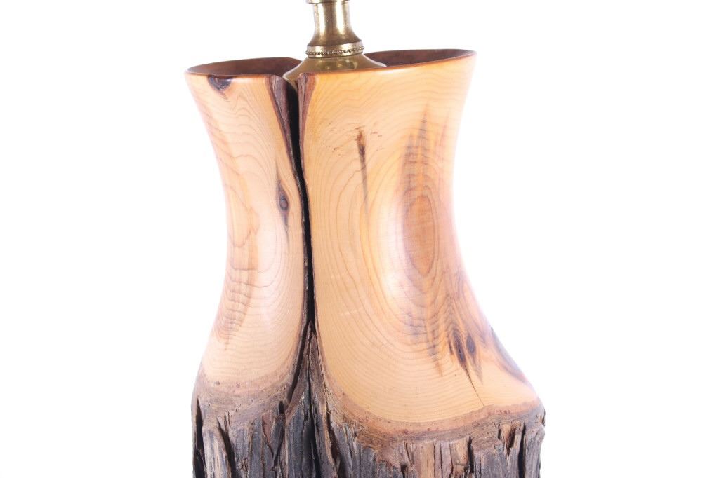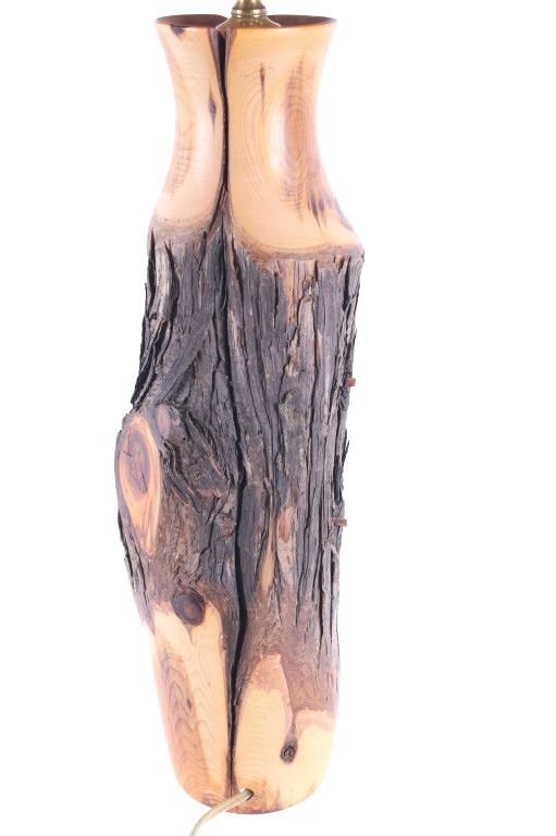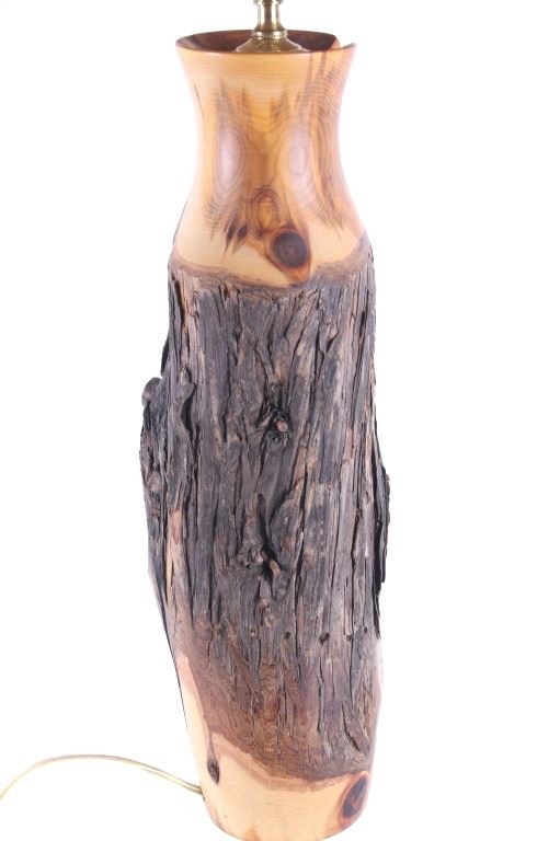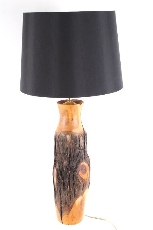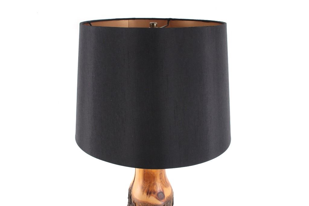 Offered in this lot is a large turned cedar fence post Adirondack style lamp. The body of the lamp is a piece of cedar fence post that has been turned on a lathe to sand and expose the beauty of the wood while leaving the ruff weathered bark. The lamp has a 14" diameter black cloth shade with a gold satin lining. The lamp base is 18" tall 51/2" across. The lamps total height with shade is 29 1/2". The lamp is in very good condition.