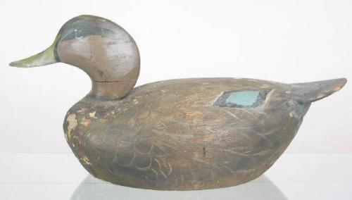 Turned head balsa black duck decoy in the Ward Brothers style. In old mostly OP with wear and dings. Written on the bottom in ink "Oliver Lawson, 1958". (decoy)
