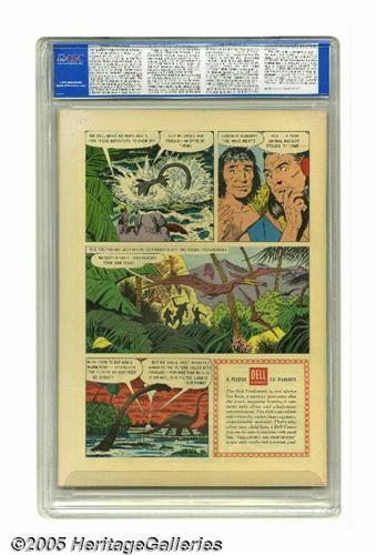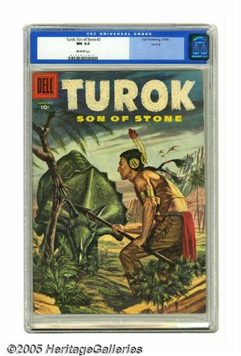 <B>Turok #3 Circle 8 pedigree (Dell, 1956) CGC NM 9.4 Off-white pages.</B></I> This series actually started with #3, following the character's first two appearances in <B>Four Color</B></I>. The book has one of the lush painted covers that were a Dell trademark. Overstreet 2005 NM- 9.2 value = $325. CGC census 1/05: 5 in 9.4, none higher. <I>From the collection of Chris Bell.</B></I>