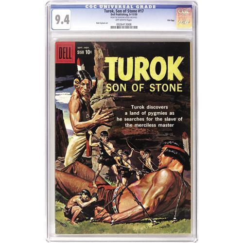 <B>Turok File Copies CGC Group (Dell and Gold Key, 1959-80).</B></I> Spanning over 20 years, this group includes <B>CGC NM+ 9.6</B></I> copies of #64, 73, 100, and 125; <B>CGC NM 9.4</B></I> copies of #16, 17, 18, 22, 24, 26, and 59; a <B>CGC NM- 9.2</B></I> copy of #28; <B>CGC VF/NM 9.0</B></I> copies of #20 and 21; and a <B>CGC VF 8.0</B></I> copy of #19. Approximate Overstreet value for group = $1,500. <I>From the Random House Archives.</B></I> <BR><BR><B>Important notice:</B> Heritage usually auctions material at the rate of 200-250 lots per hour. On some occasions eBay Live bid software or the Internet may not be able to keep up with the pace of the auction. We recommend placing a realistic absentee bid now as insurance to avoid disappointment. Occasionally the auctioneer may eliminate or reject an eBay Live bid, and the auctioneer may also reopen a lot after the close of the eBay live bidding (usually because we missed an audience bid), and may reject your bid even if it shows you as the winning bidder. By bidding via eBay Live, you agree that Heritage may award the lot to another bidder at its sole discretion under the circumstances described above or any other reasonable circumstances. Since eBay bids are not shown to us until we open the lot on the floor, we treat those bids just like floor bids. In most cases the floor responds before the eBay bid is presented to us, due to Internet lag time, so for consistency we have made it a policy that floor bids are always considered first over tie eBay live bids. Also please note that all Heritage lots purchased through eBay Live carry a 22.5% Buyer's Premium. Please make sure you read the Terms and Conditions before you bid. This lot is being auctioned in conjunction with a live floor auction by Heritage Auction Galleries. All final auction and invoice information will be supplied by Heritage Auction Galleries, and all other information should be considered preliminary. Lot:41001 <BR><BR><B>Winning Notification and Billing:</B> After the FINAL session in this auction is complete, Heritage will send e-mail and snail mail invoices. This process normally takes several days. All final auction and invoice information will be supplied by Heritage Auction Galleries, and all other information should be considered preliminary. <BR><BR>This auction will be conducted on a live auction floor and over the Internet through eBay Live. If you choose to place an absentee bid, please take a moment to <font color='#0000ff'><u><a href='http://pages.ebay.com/liveauctions/help/before/laabsentee.html'>learn how eBay Live absentee bidding works</a></u></font><font color='#000000'>
