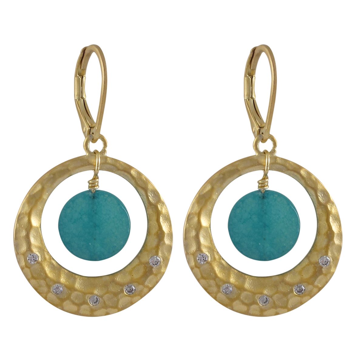 Turquoise 10Mm Round Faceted Semi Precious Stone In Matte Gold Plated Hammered 23Mm Round Ring With CZ, Lever Back Earrings, 39Mm Long
