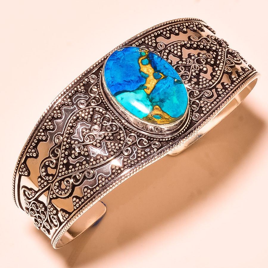 Gorgeous 18ct turquoise and copper highlighted cuff bangle bracet. Mounted in elaborately designed .925 sterling silver overlay. Total approximate weight is 31.7 grams.