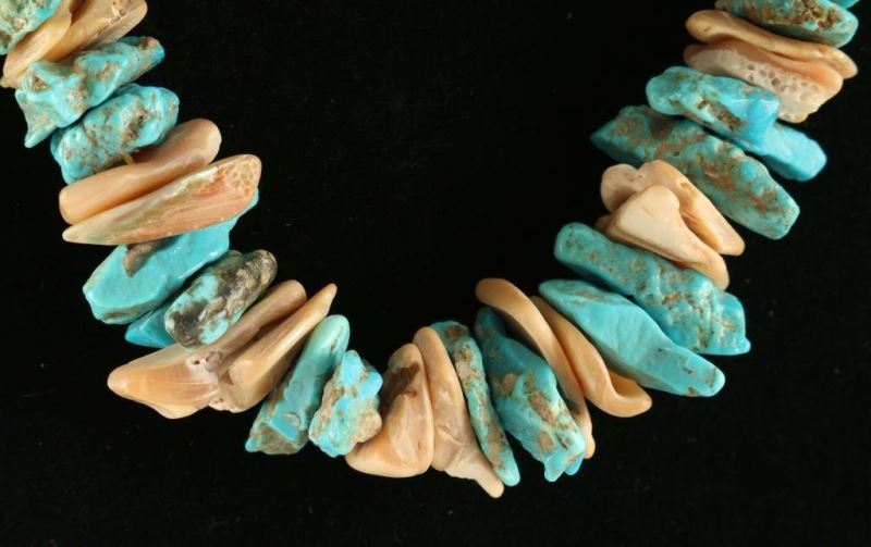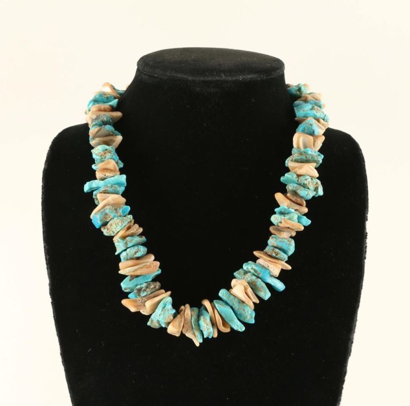Natural style nuggets of turquoise with pieces of abalone are strung together. A beautiful look straight from Mother Nature. Approx. 19" from hook to hook.