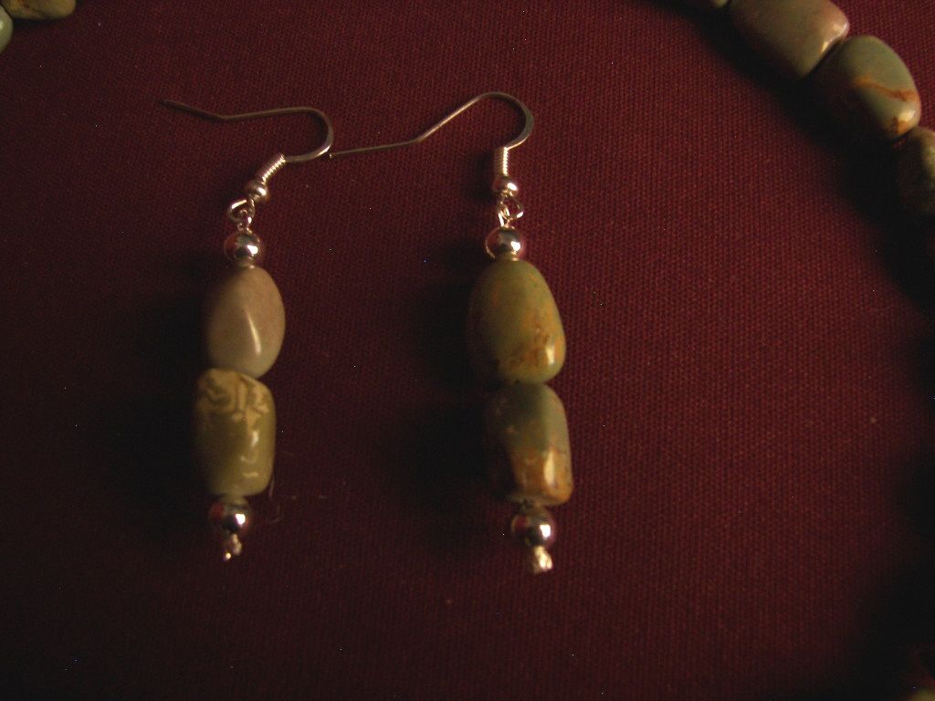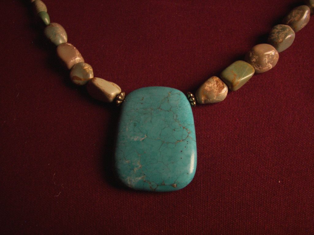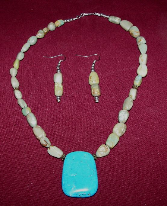 (7728) Turquoise And Silver Necklace With Green Turquoise Beads, Large Blue Turquoise Pendant, With Matching Set Of Earrings, 18" Necklace, Earrings 2"
