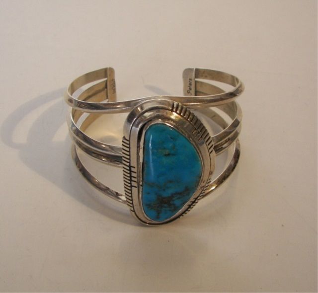Turquoise And Sterling Cuff Bracelet (7688) Turquoise And Sterling Cuff Bracelet, Signed Jon Peters, 6 1/2" 1 3/4 Wide 1 " Gap